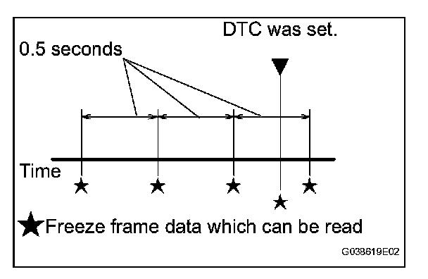 The ECM records engine conditions in the form of freeze frame data every 0.5 seconds. Using the intelligent tester, five separate sets of freeze frame data, including the data values at the time when the DTC was set, can be checked.