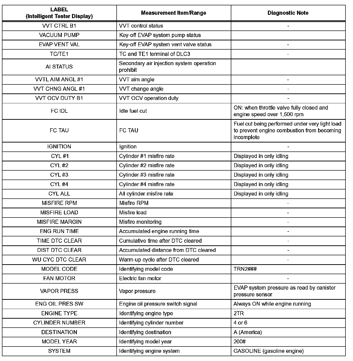 Freeze frame data record the engine conditions (fuel system, calculated load, engine coolant temperature, fuel trim, engine speed, vehicle speed, etc.) when a malfunction is detected. When troubleshooting, it can help determine if the vehicle was running or stopped, the engine was warmed up or not, the air-fuel ratio was LEAN or RICH, and other data, from the time the malfunction occurred.
