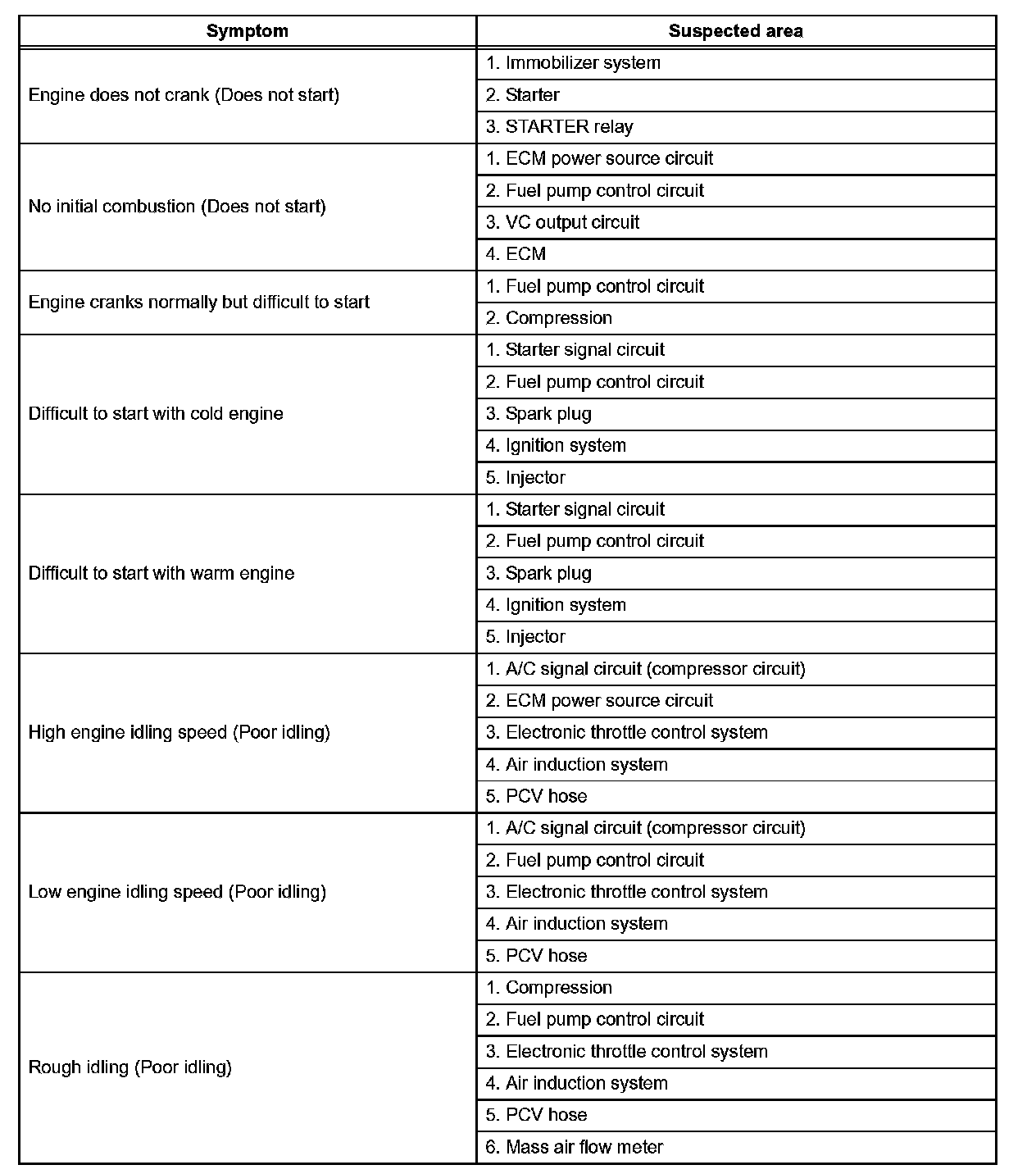HINT: Use the table given to help determine the cause of the problem symptom. The potential cases of the symptoms are listed in order of probability in the "Suspected Area" column of the table. Check each symptom by checking the suspected areas in the order they are listed. Replace parts as necessary.