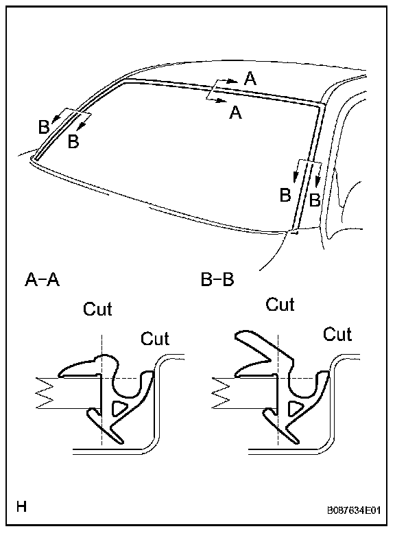 a. Using a knife, cut off the windshield upper moulding outer, as shown in the illustration.