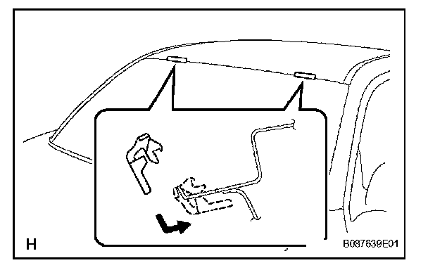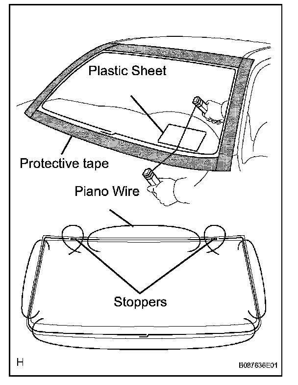b. From the interior, insert piano wires between the vehicle body and windshield glass, as shown in the illustration.