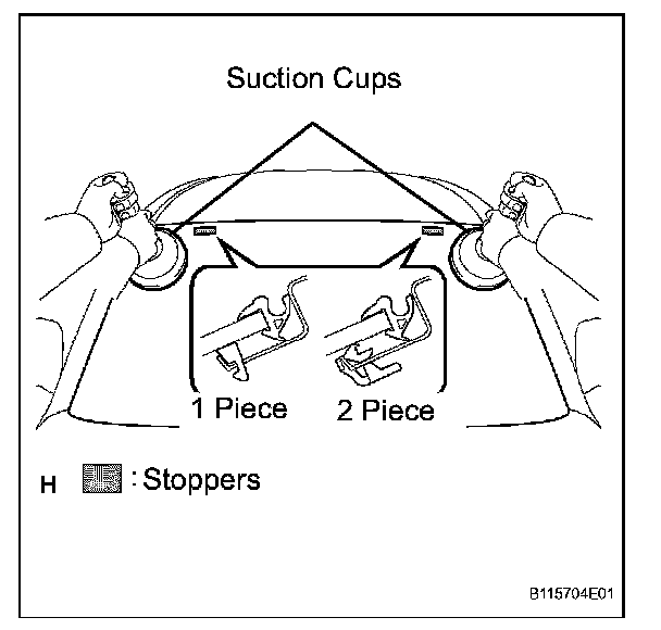 b. Install 2 new stoppers onto the windshield glass, as shown in the illustration.