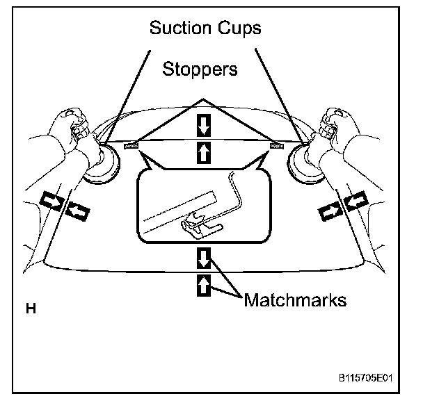 1. Using suction cups, position the windshield glass so that the matchmarks are aligned. Press it in gently along the rim