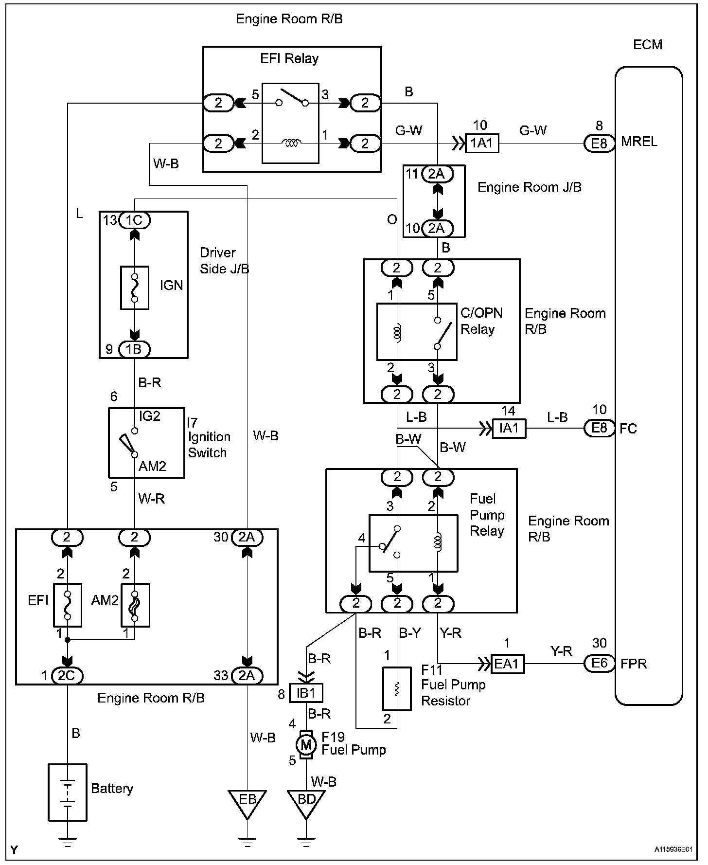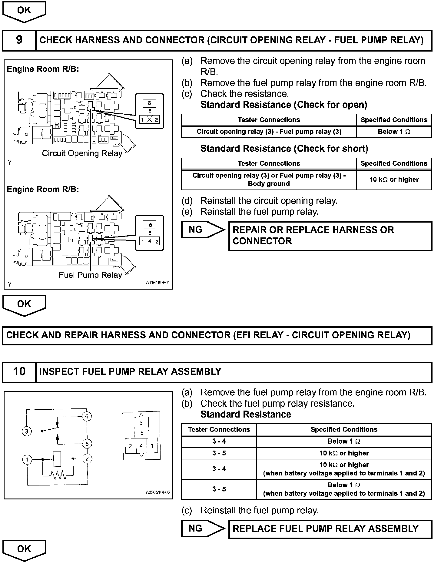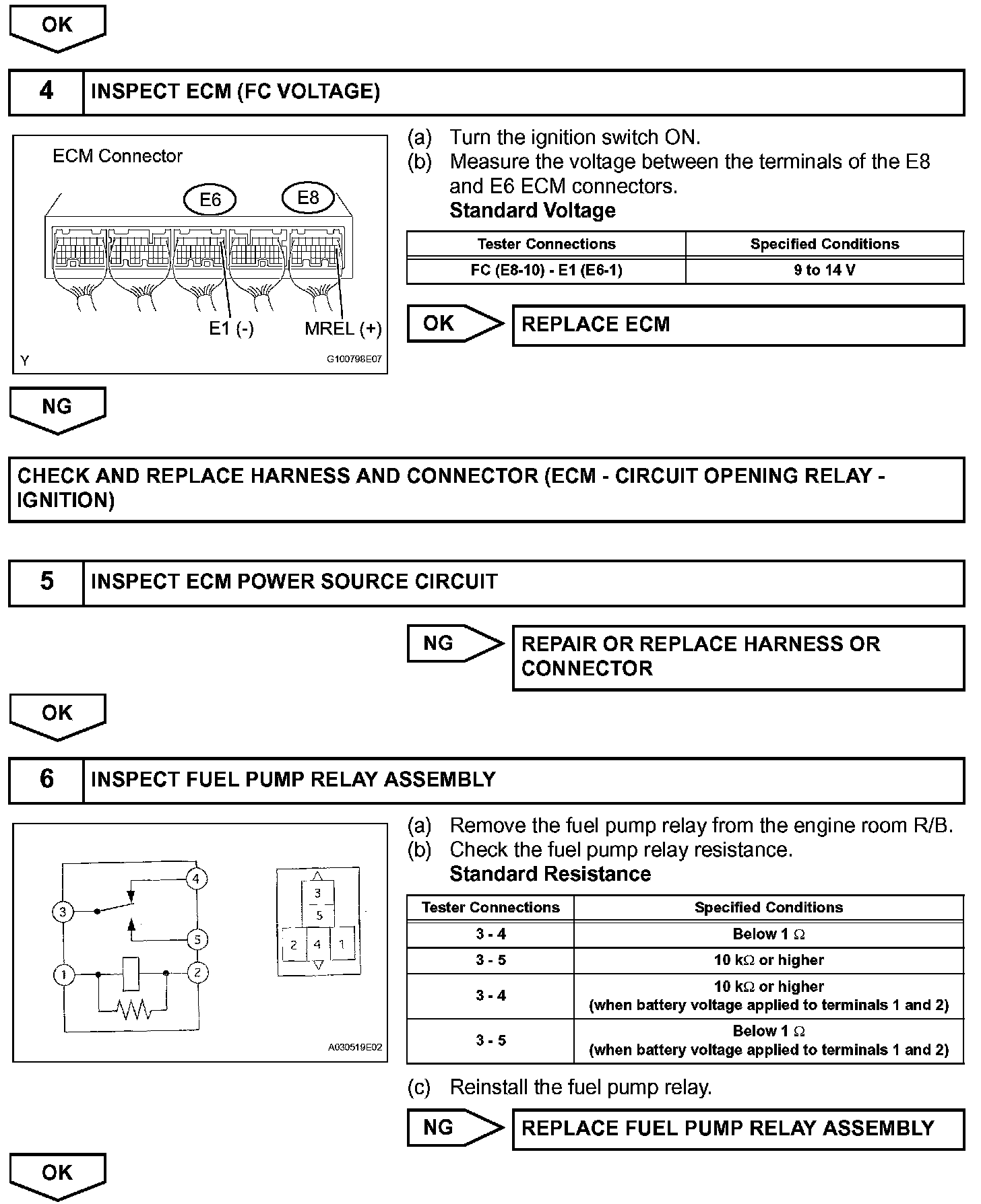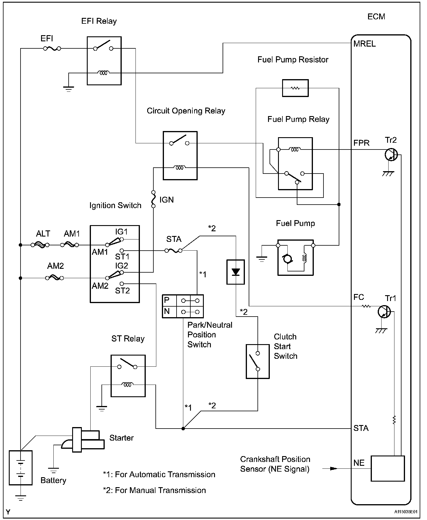 When the STA signal and NE signal are input to the ECM, Tr1 (power transistor 1) is turned ON, current flows to the coil of the circuit opening relay, the relay switches on, power is supplied to the fuel pump, and the fuel pump operates.