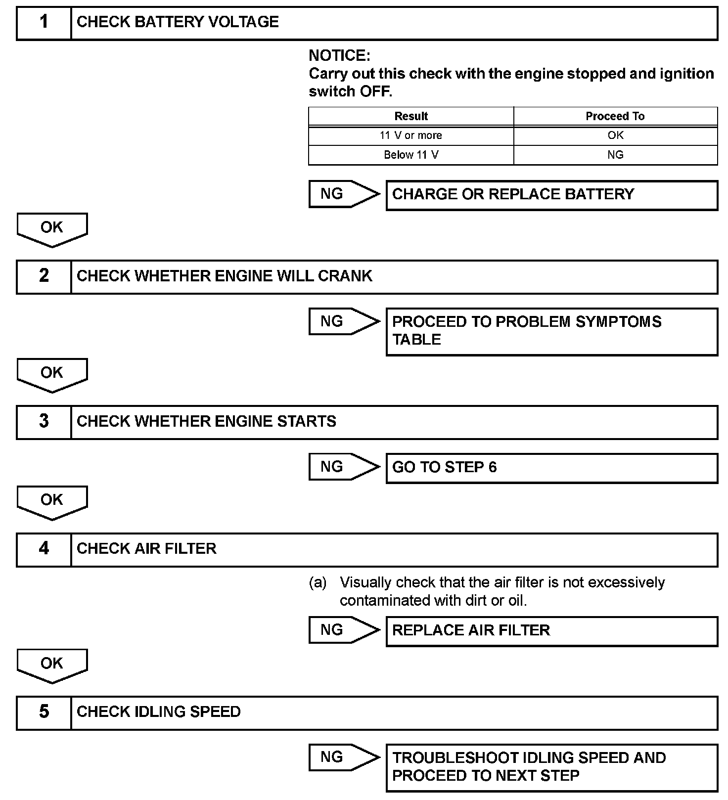 When a malfunction is not confirmed by the DTC check, troubleshooting should be carried out in all circuits considered to be possible causes of the problem. In many cases, by carrying out the basic engine check shown in the flowchart, the location of the problem can be found quickly and efficiently. Therefore, using this check is essential when engine troubleshooting.