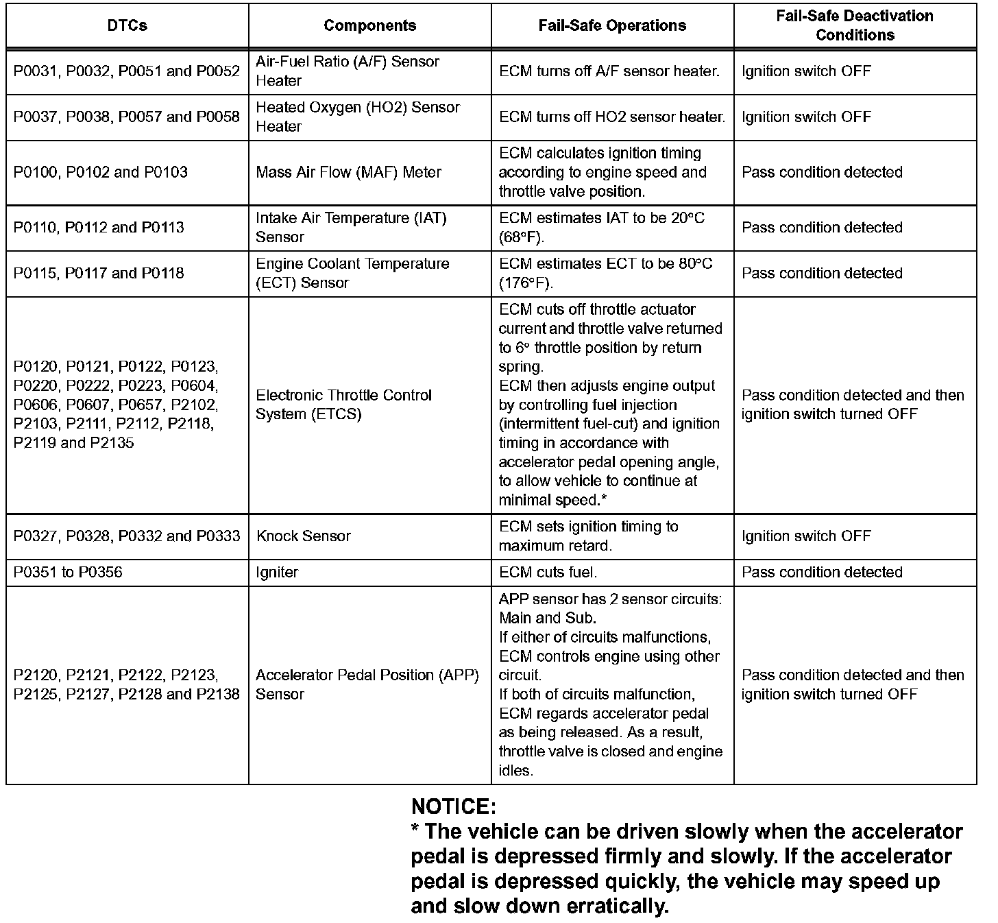 If any of the given DTCs are set, the ECM enters fail-safe mode to allow the vehicle to be driven temporarily.