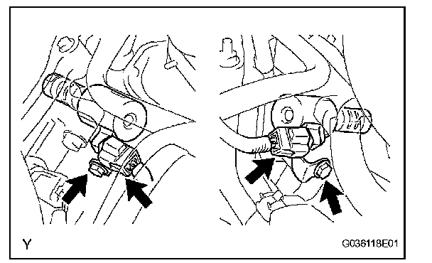 b. Remove the 2 bolts, then remove the 2 camshaft timing oil control valves.