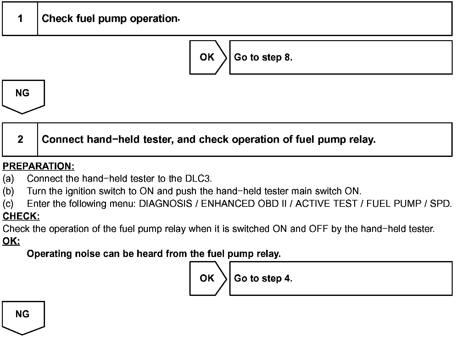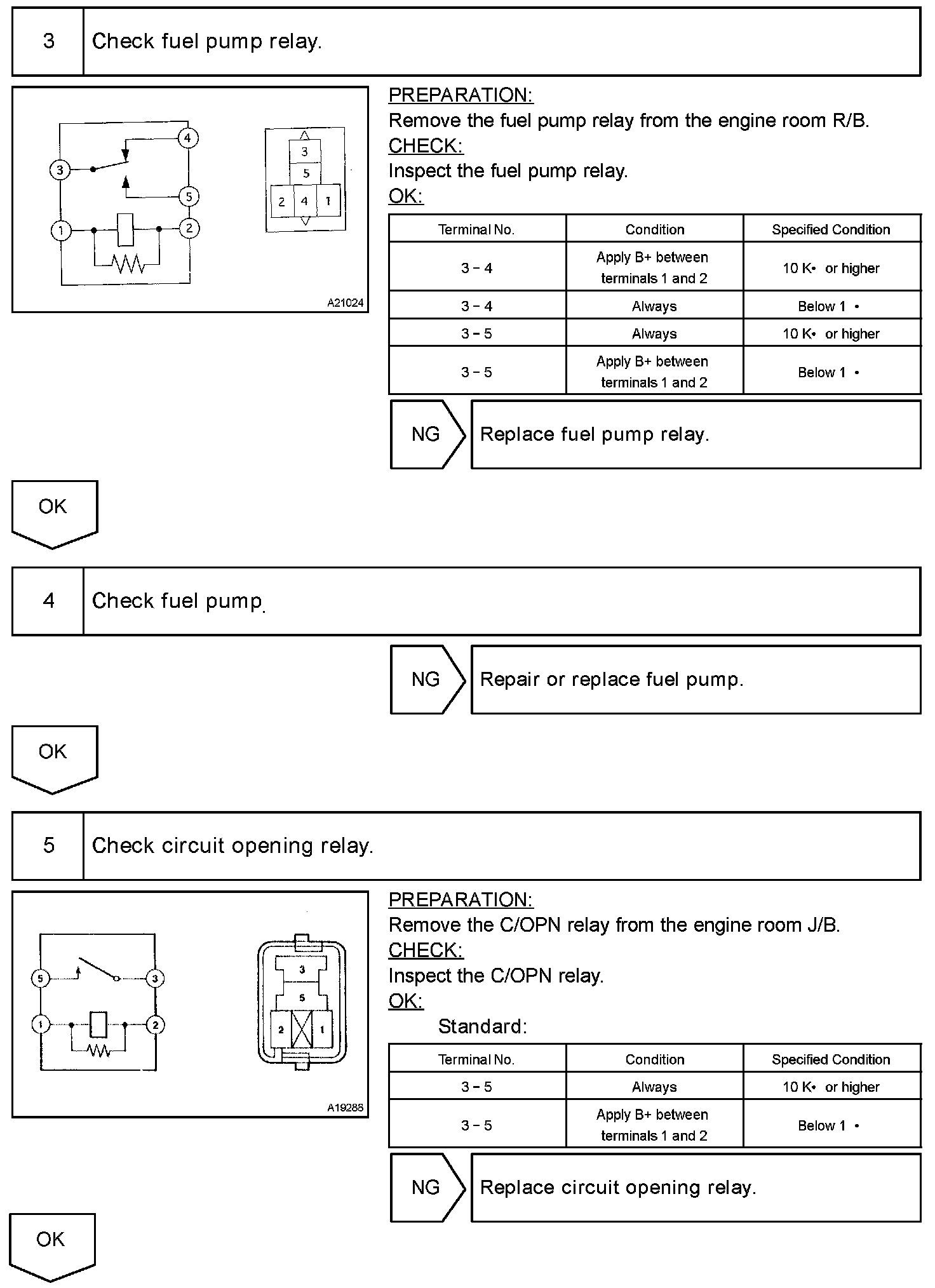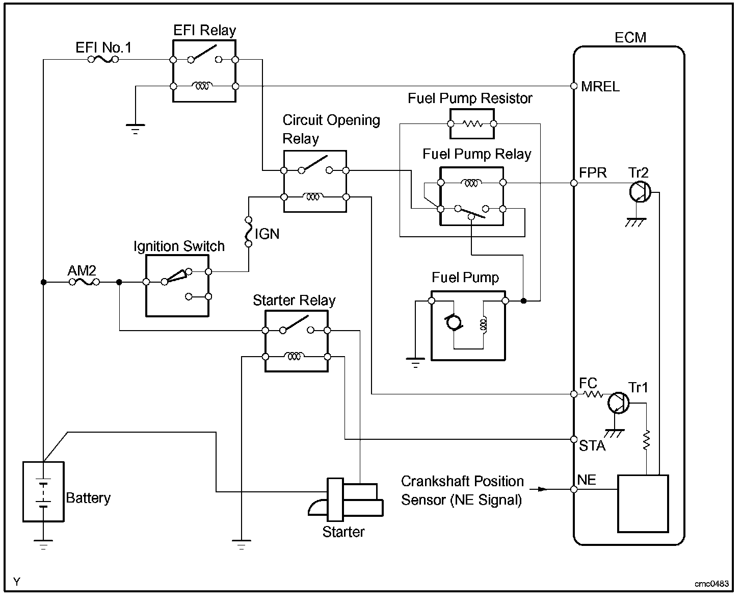 In the diagram, when the engine is cranked, current flows from terminal STAR of the ECM to the starter relay coil and also current flows to terminal STA of the ECM (STA signal). When the STA signal and NE signal are input to the ECM, the Tr1 is turned ON, current flows to the coil of the circuit opening relay, the relay switches on, power is supplied to the fuel pump, and the fuel pump operates.