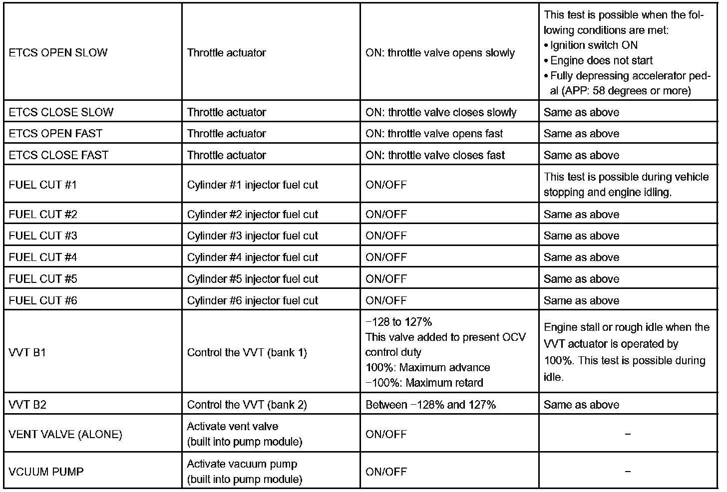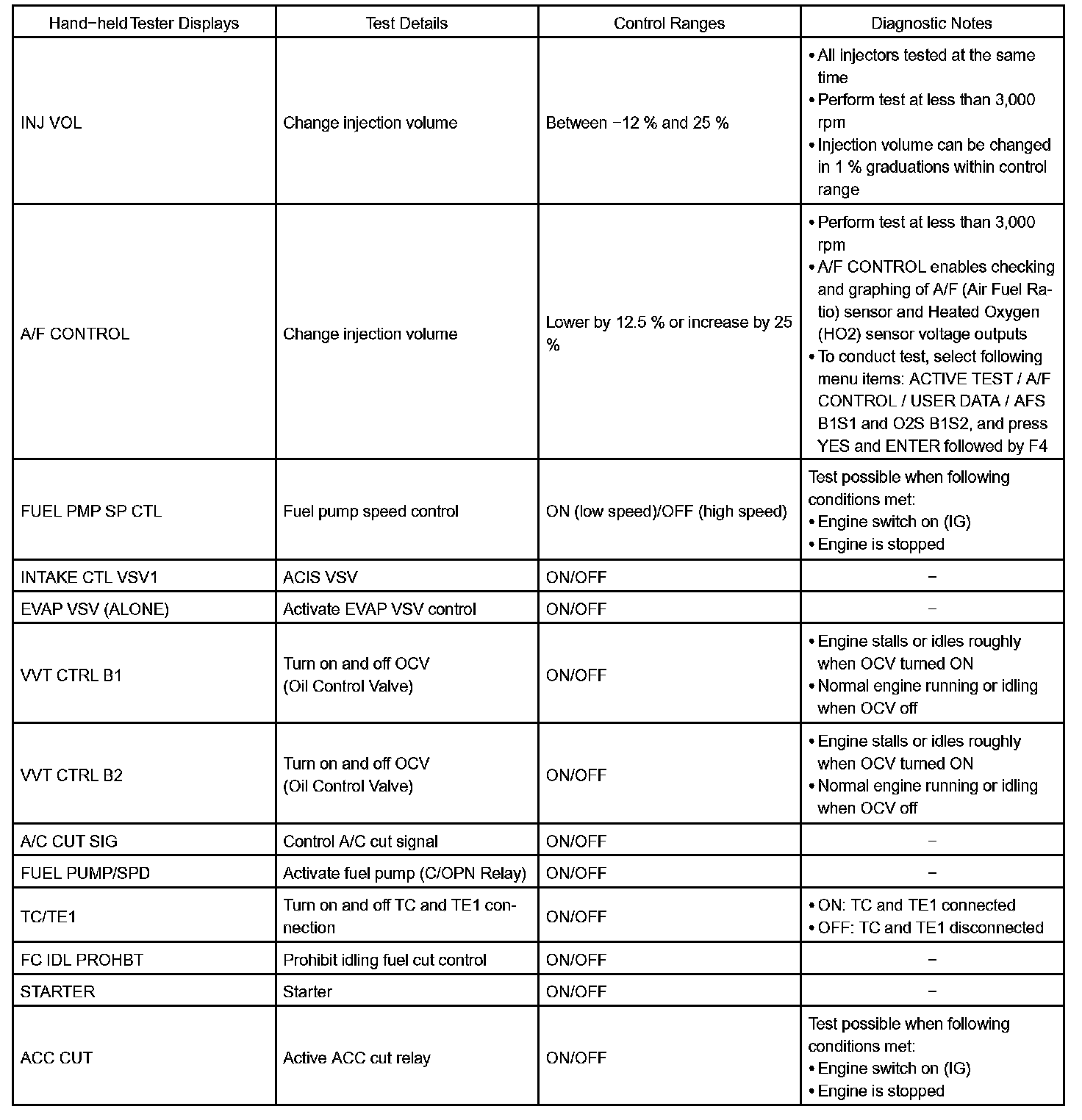 ACTIVE TESTHINT: Performing an ACTIVE TEST enables components including the relays, VSV (Vacuum Switching Valve), and actuators, to be operated without removing any parts. The ACTIVE TEST can be performed with a hand-held tester. Performing an ACTIVE TEST as the first step of troubleshooting is one method of shortening diagnostic time.