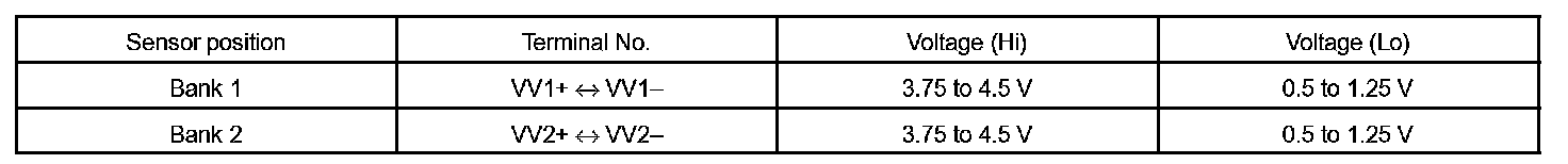 c. While turning the crankshaft pulley by hand, measure the voltage between each terminal. Check that the voltage changes between the Hi range and Lo range as shown in the table.