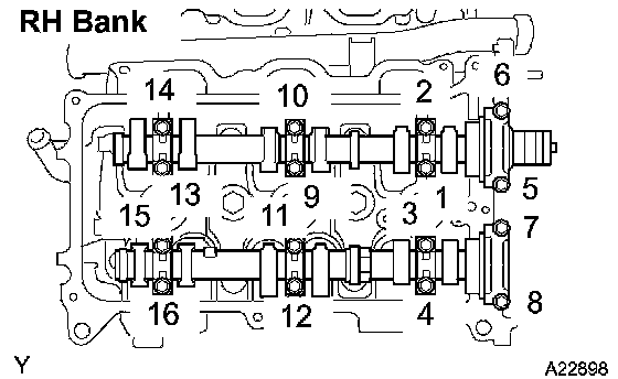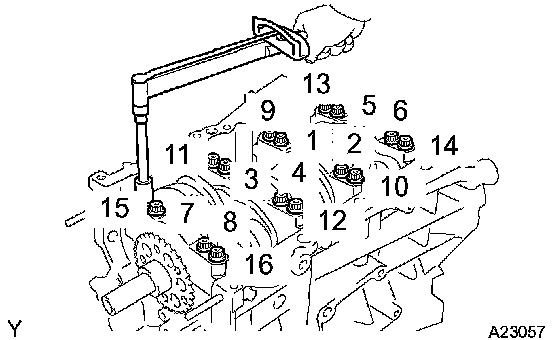 Install the 16 bearing cap bolts. Using several steps, tighten the bolts uniformly in the sequence as shown in the illustration.