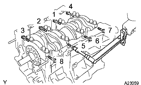 Using several steps, uniformly tighten the 8 main bearing cap bolts in the sequence as shown in the illustration.