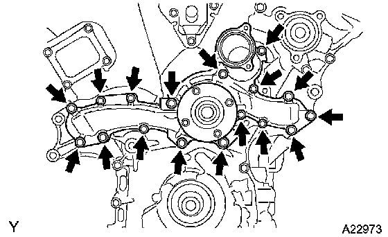 Install a new gasket and the water pump with the 17 bolts.