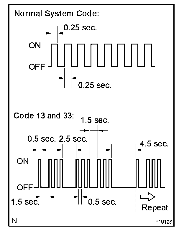 3. Read and record any DTCs from the tire pressure warning lamp on the combination meter. Refer to the illustration on the left for examples of a normal system code and codes 13 and 33.