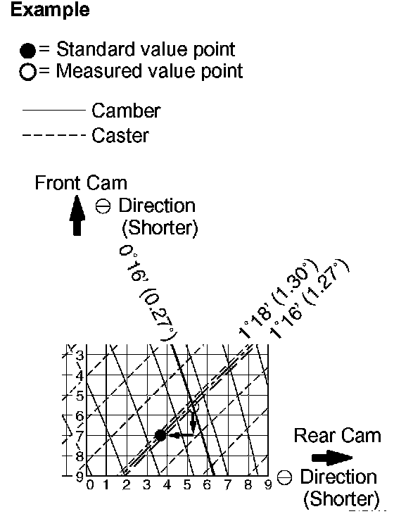 5 As shown in the example chart, read the distance from the measured value to the standard value, and adjust the front and/or rear adjusting cams accordingly.