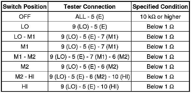 (1) Using an ohmmeter, measure the resistance and check the results in accordance with the values in the table below.