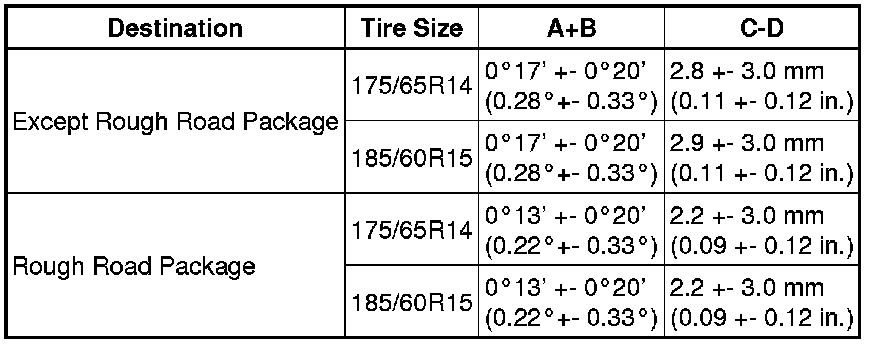 The tolerance for the difference between the left and right wheels is 30' (0.5°) or less for both cambers.