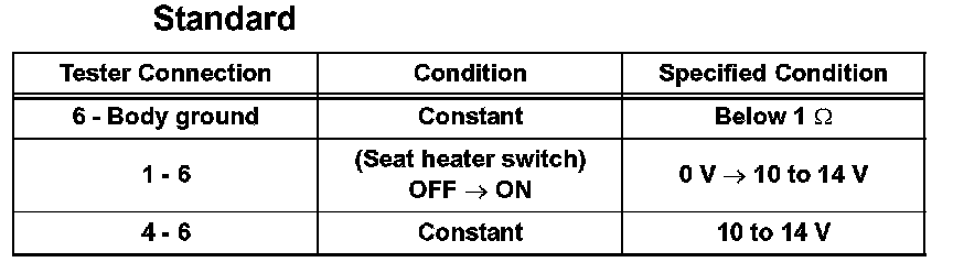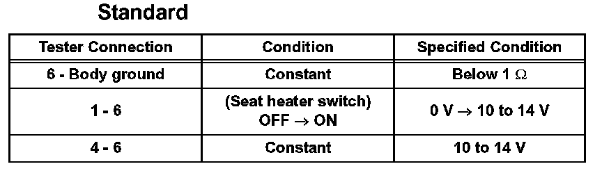 If the result is not as specified, there may be a malfunction on the wire harness side or seat heater switch.