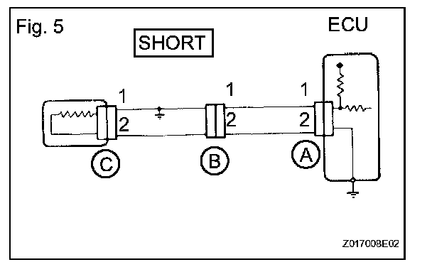 a. If the wire harness is ground shorted (Fig. 5), locate the section by conducting a resistance check with the body ground.