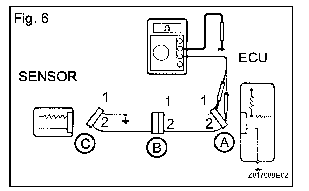 HINT: Measure the resistance while lightly shaking the wire harness vertically and horizontally. If your results match the examples, an open circuit exists between terminal 1 of connector A and terminal 1 of connector C.