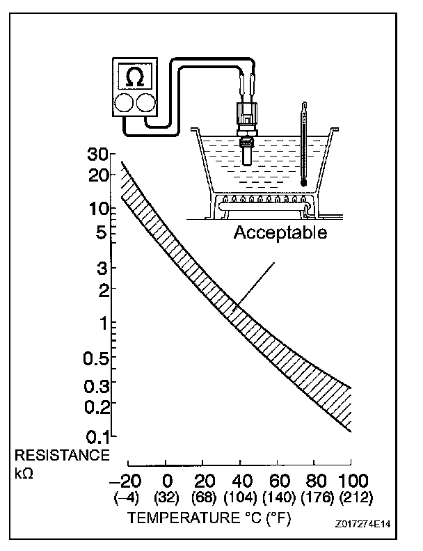 NOTE: If checking the engine coolant temperature sensor in water, be careful not to allow water to enter the terminals. After checking, wipe the water off the engine coolant temperature sensor.