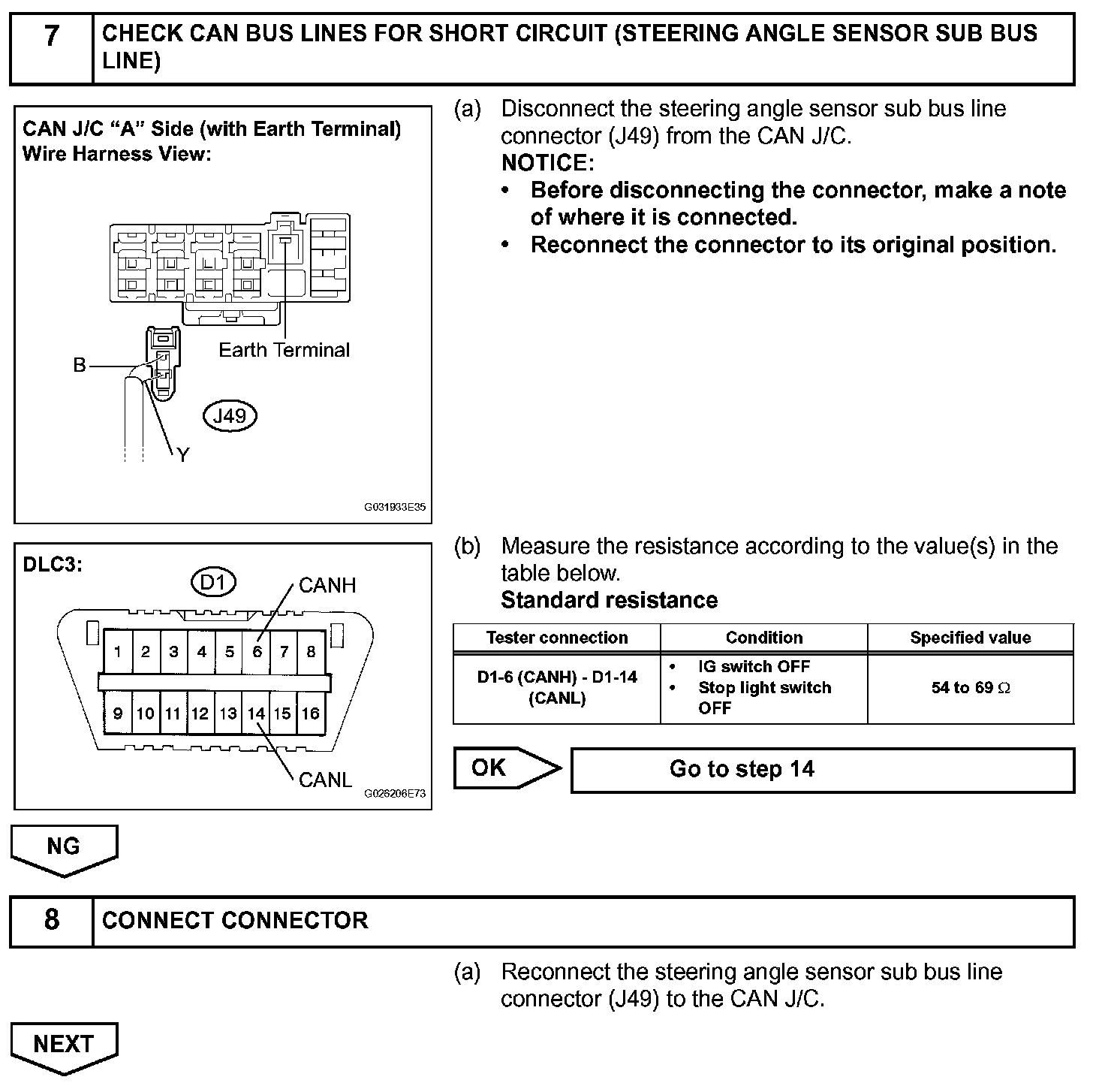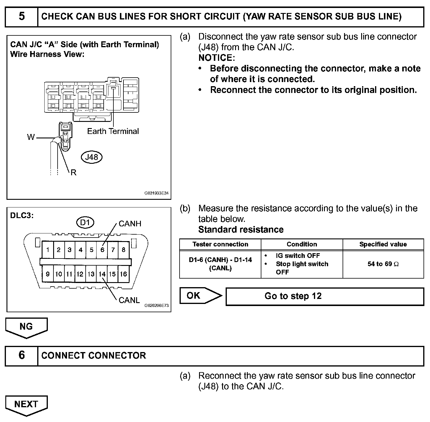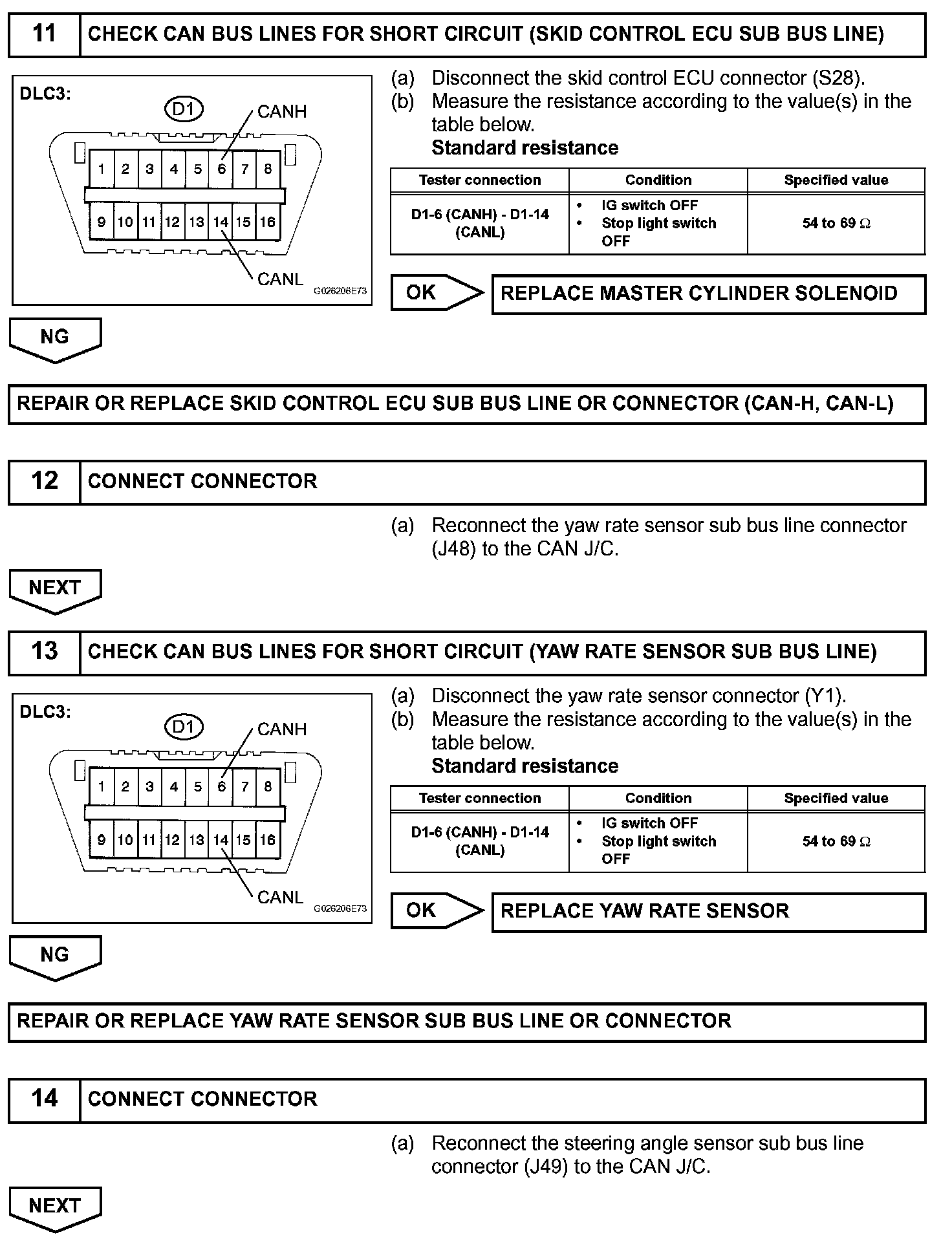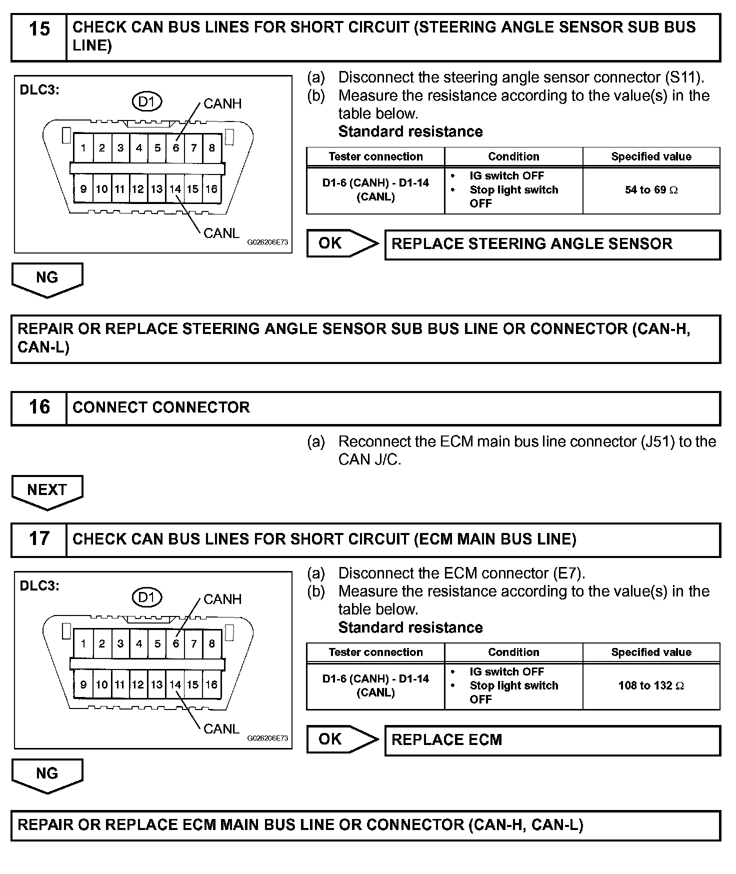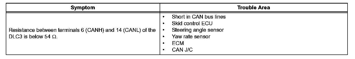 The CAN bus lines are considered to be shorted when the resistance between terminals 6 (CANH) and 14 (CANL) of the DLC3 is below 54 ohms.