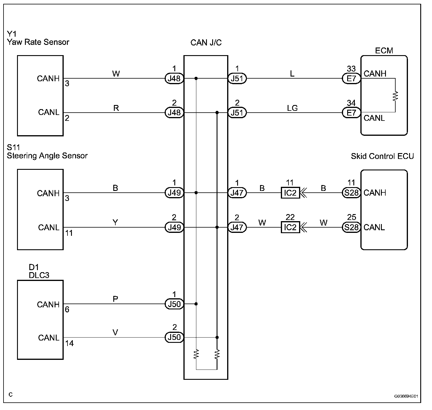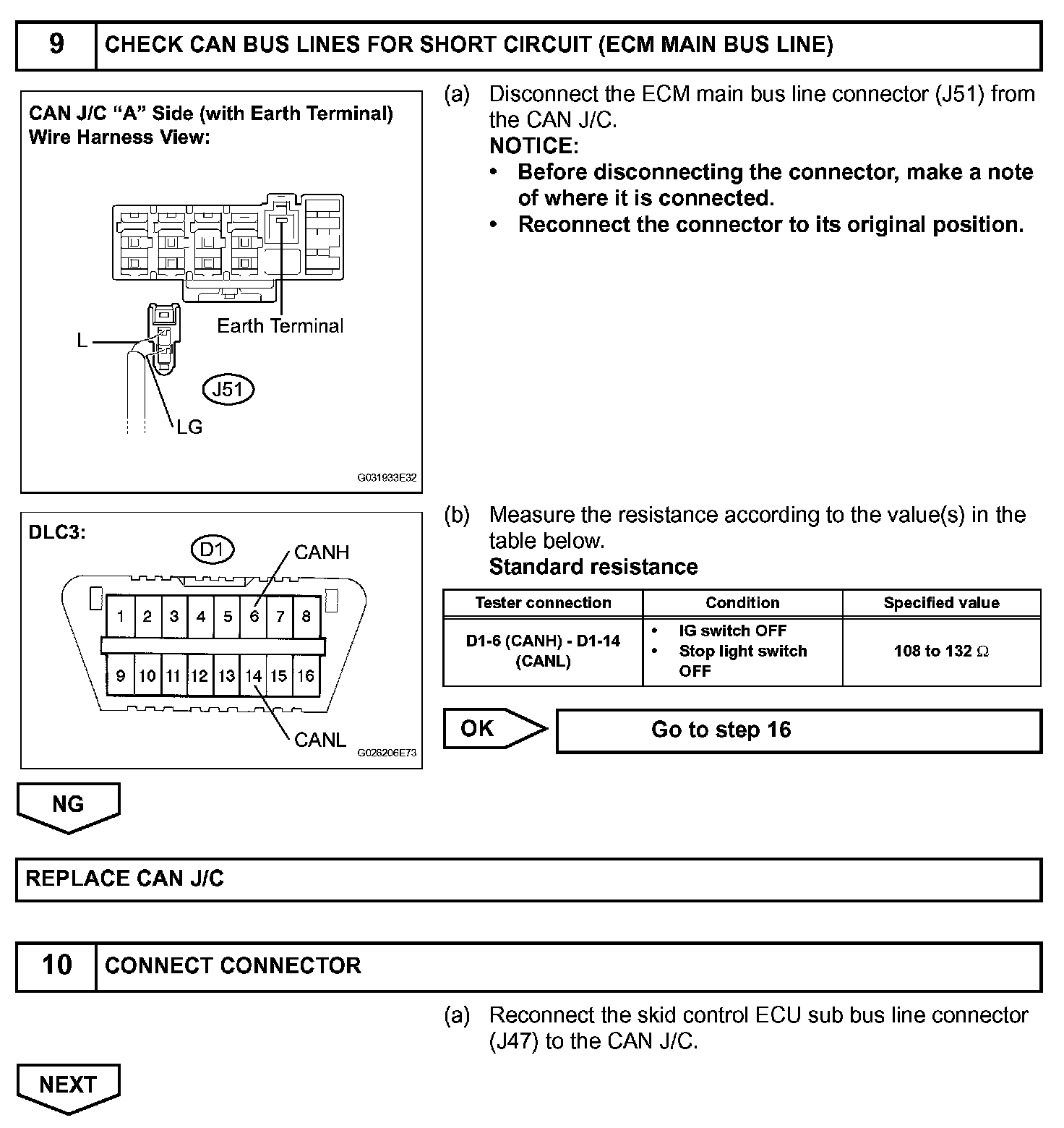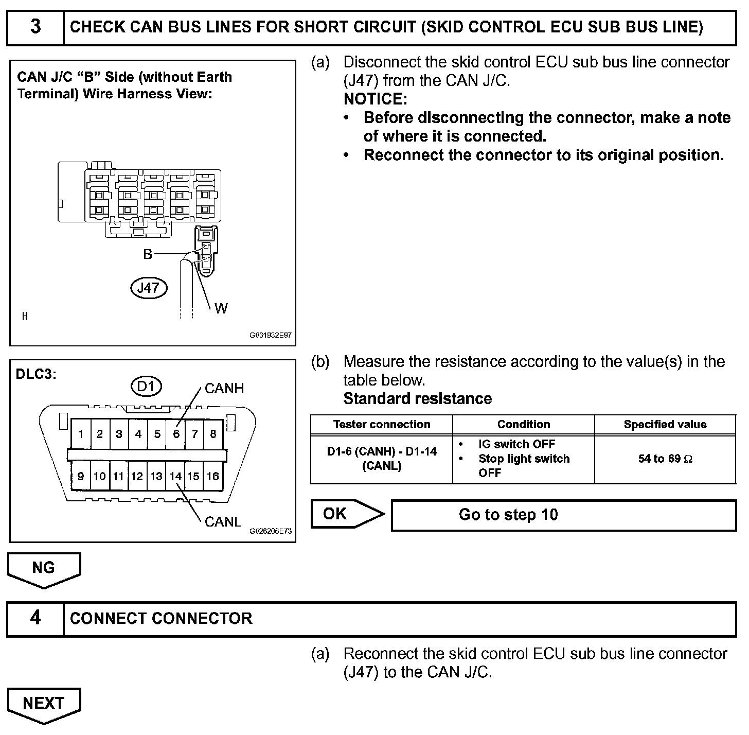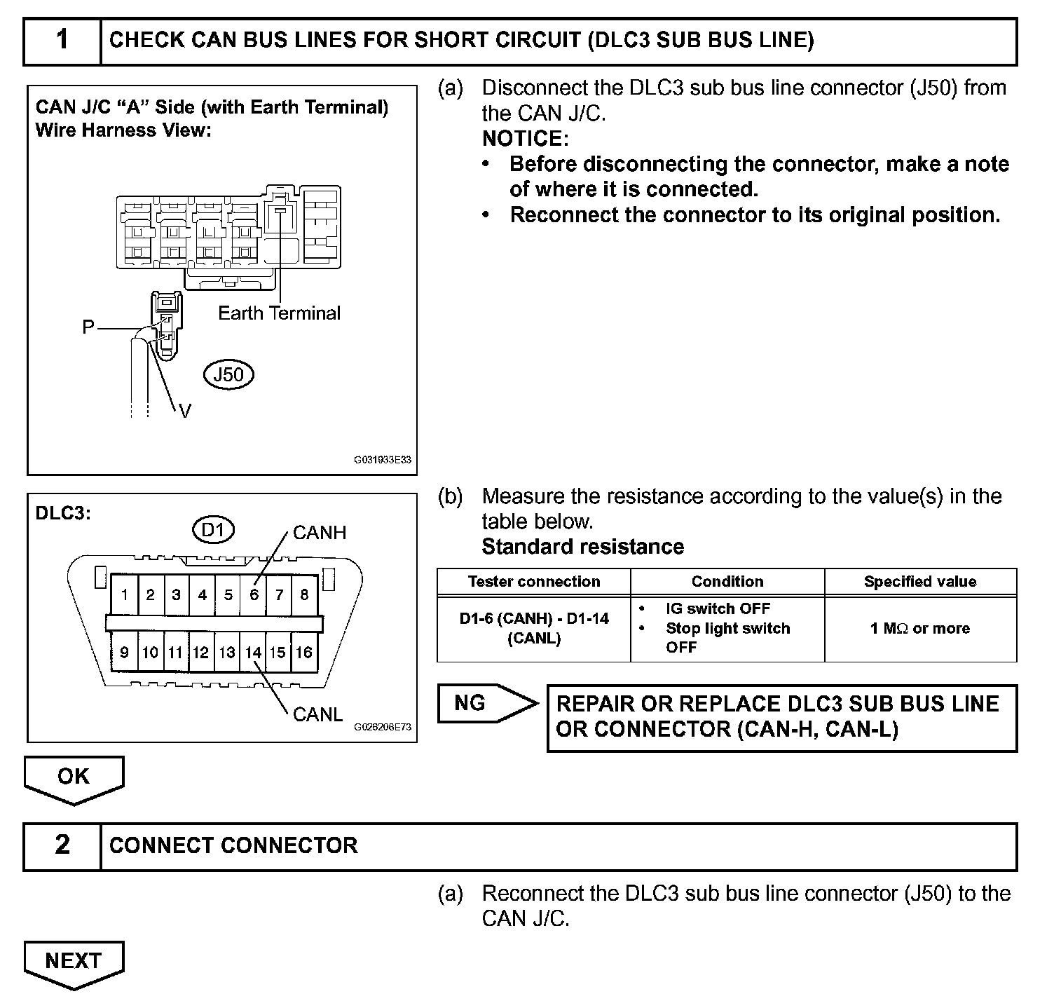 The CAN bus lines are considered to be shorted when the resistance between terminals 6 (CANH) and 14 (CANL) of the DLC3 is below 54 ohms.