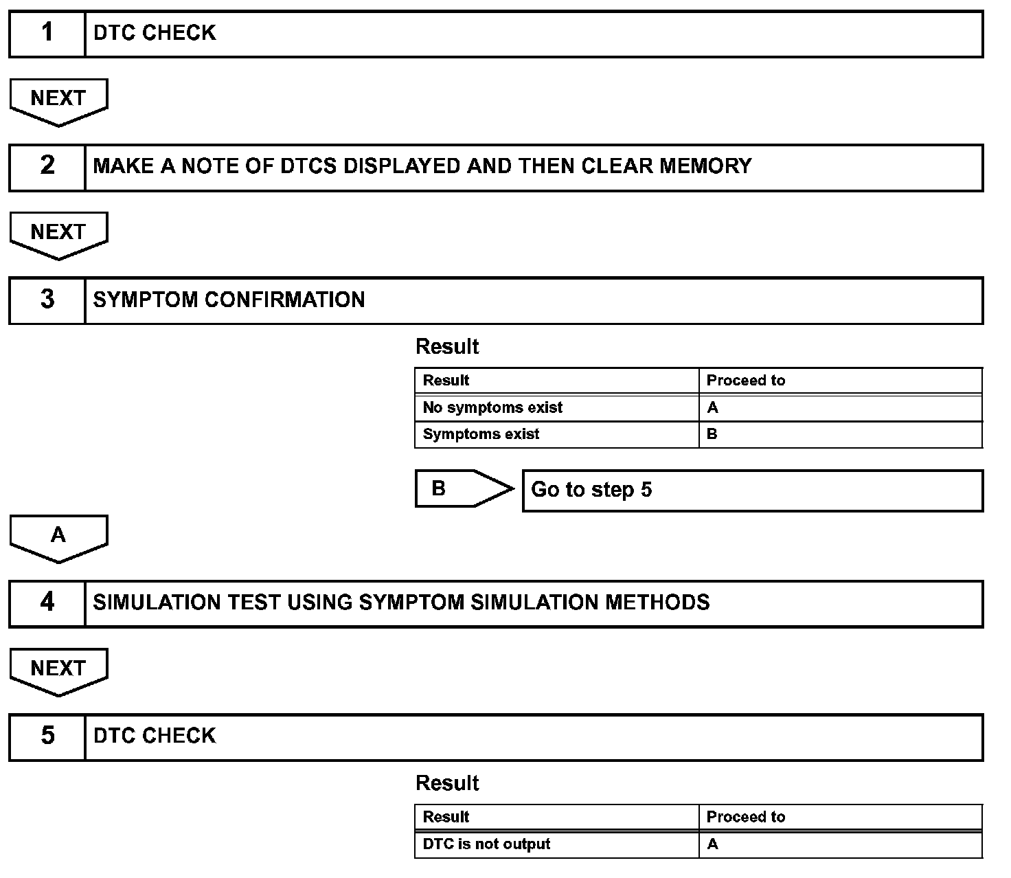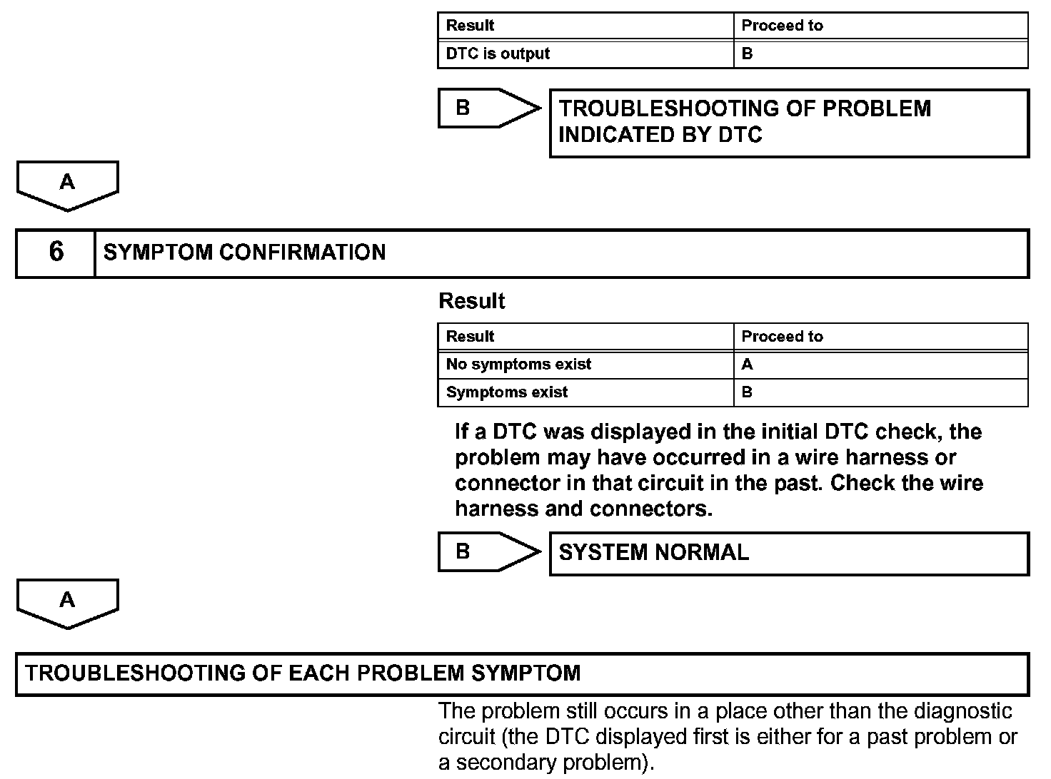 - In the DTC check, it is very important to determine whether the problem indicated by the DTC either: 1) still occurs, or 2) occurred in the past but has returned to normal. In addition, the DTC should be compared to the problem symptom to see if they are related. For this reason, DTCs should be checked before and after confirmation of symptoms (i.e., whether or not problem symptoms exist) to determine current system conditions, as shown in the flowchart.