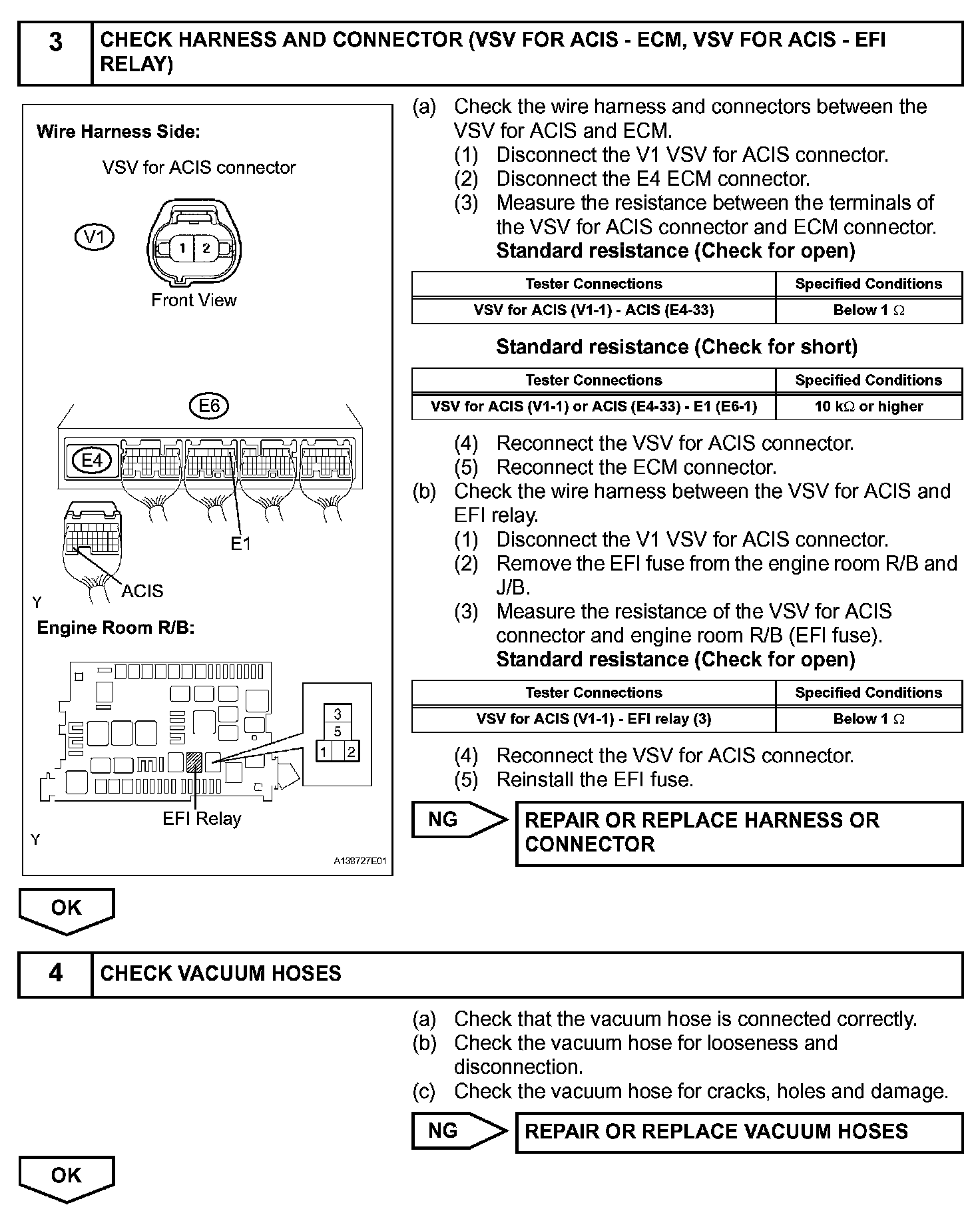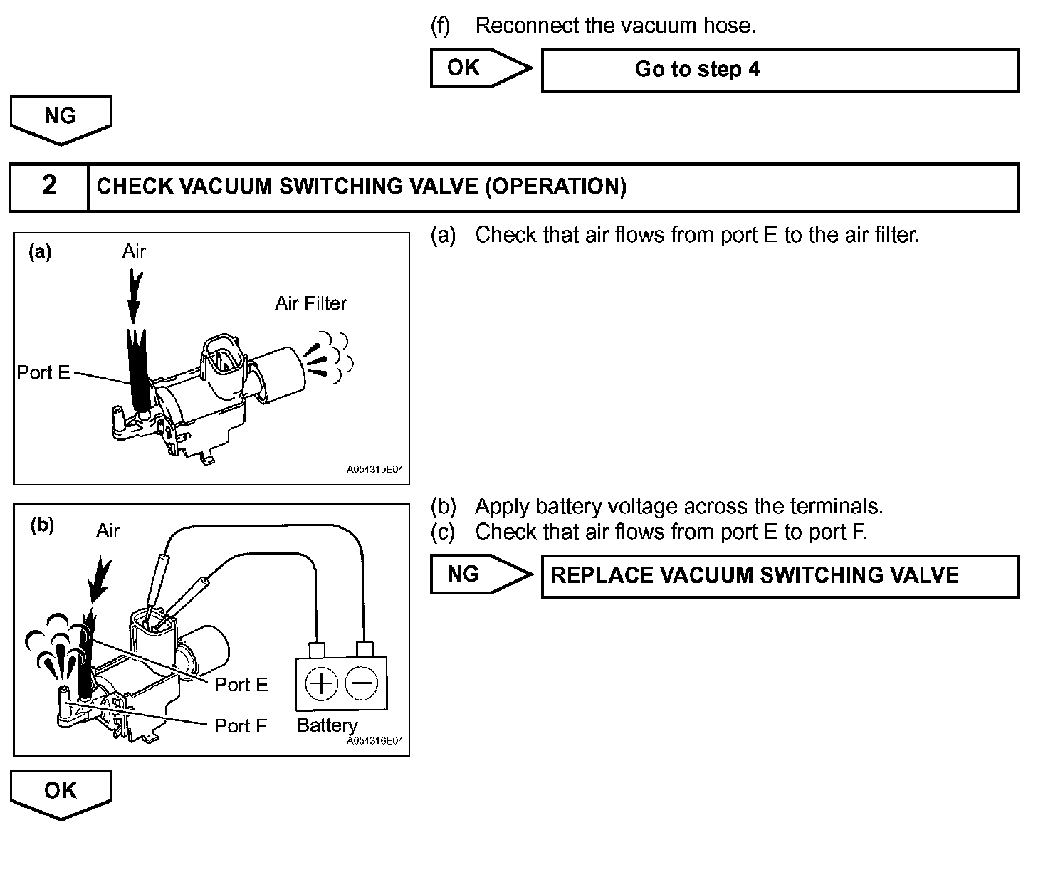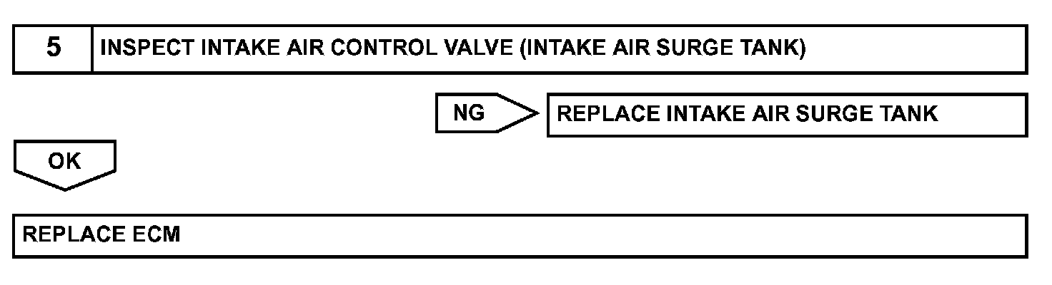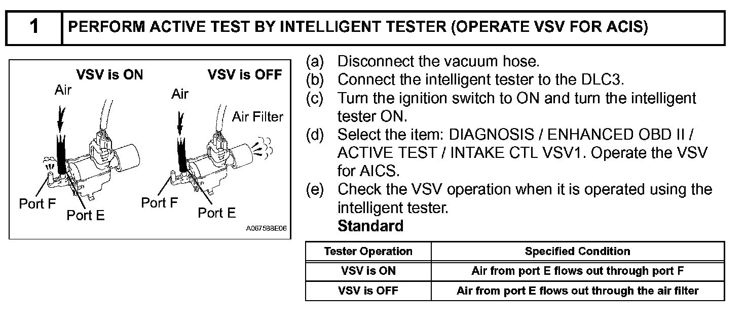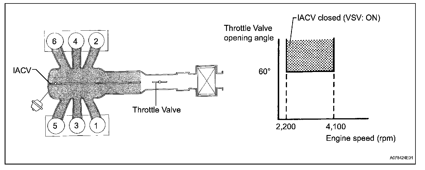 When the engine speed is between 2,200 and 4,100 rpm and the throttle valve opening angle is 60° or more, the ECM supplies current to the VSV (ON status), so the IACV will close. Besides that condition, the VSV is usually OFF and the IACV is open.