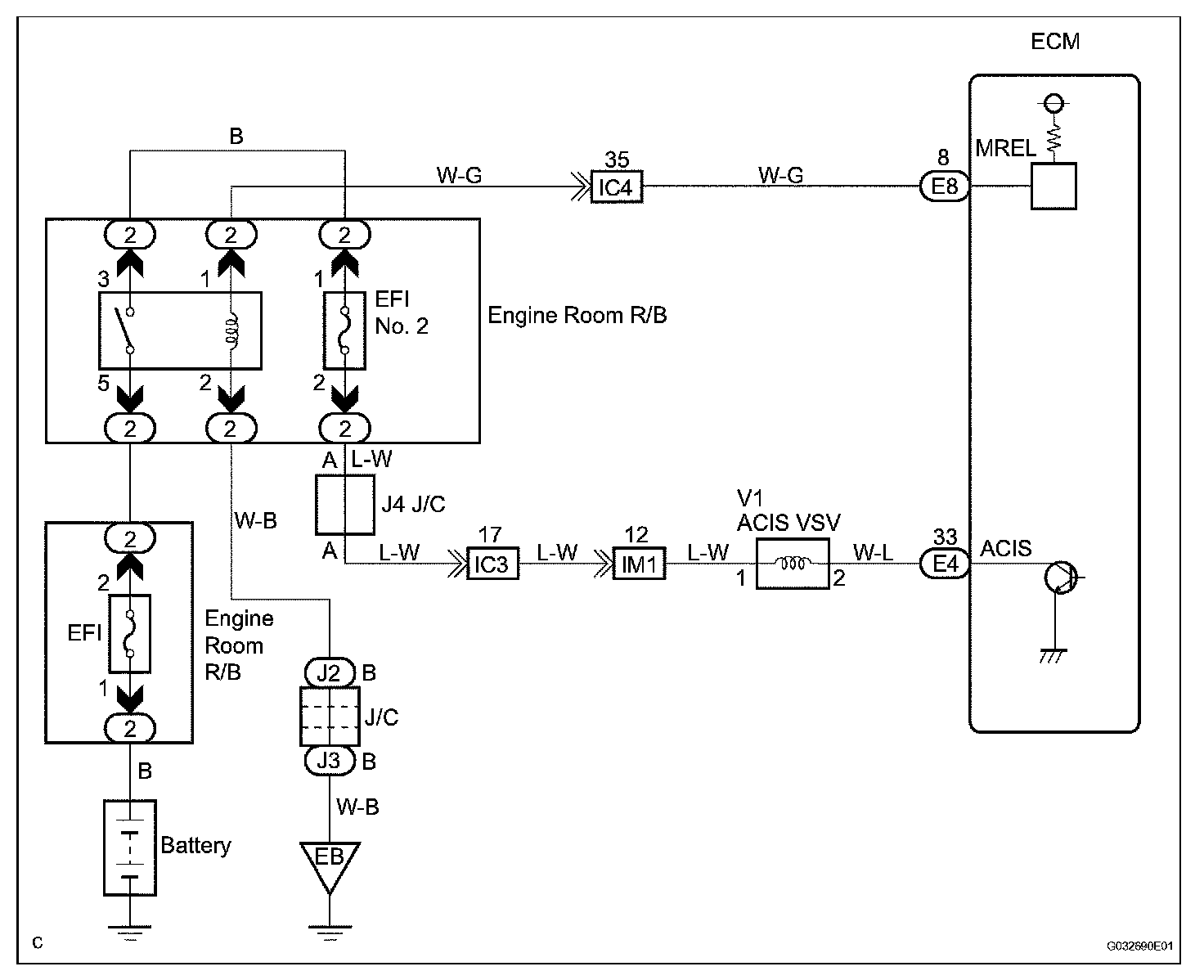 This circuit opens and closes the Intake Air Control Valve (IACV) in response to the engine load in order to increase the intake efficiency (ACIS: Acoustic Control Induction System).