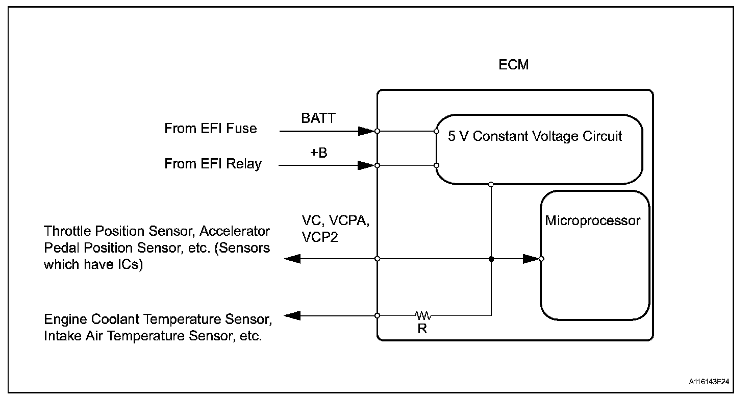 The ECM constantly generates 5 V power from the battery voltage supplied to the +B (BATT) terminal to operate the microprocessor. The ECM also provides this power to the sensors through the VC output circuit.