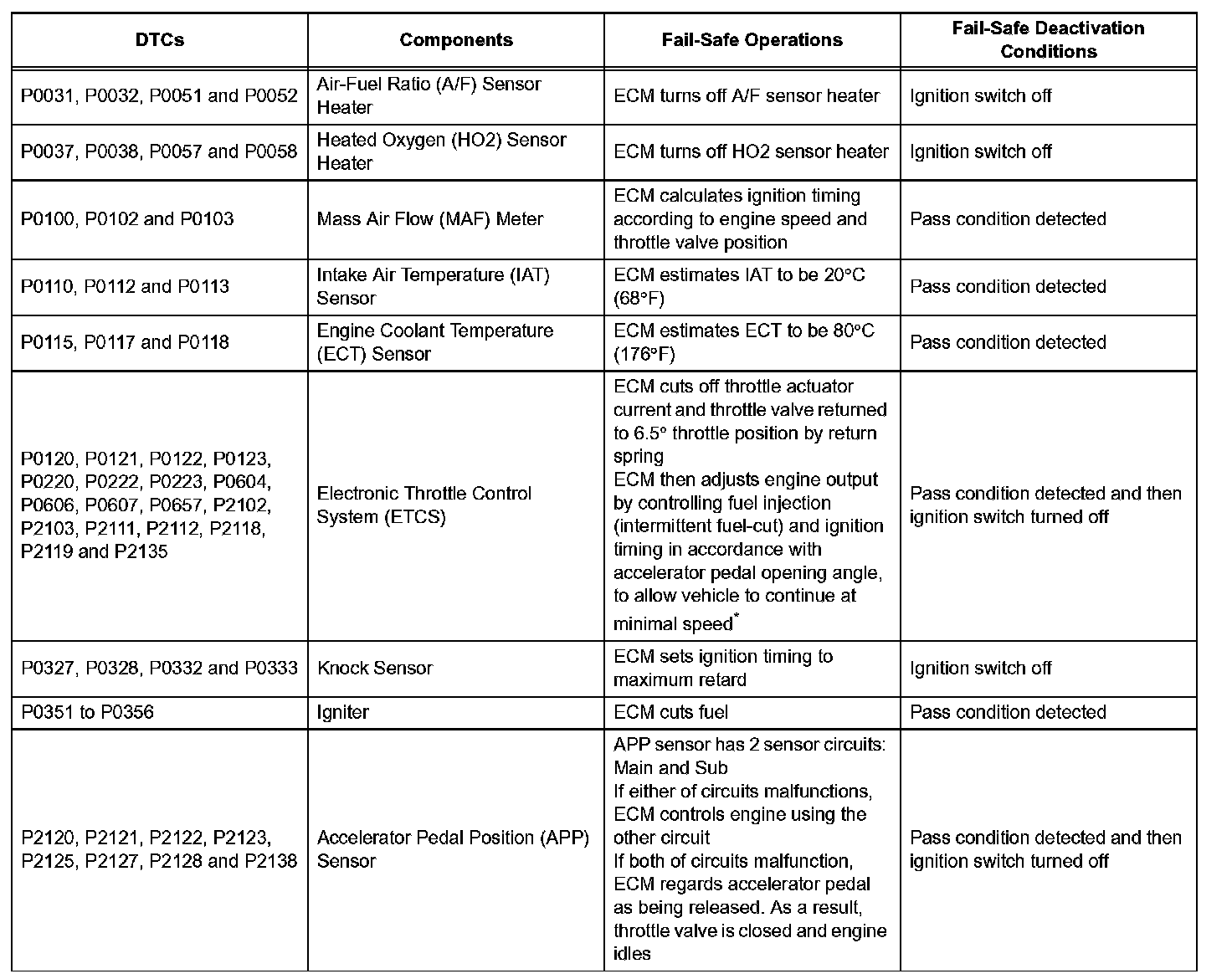 If any of the following DTCs are set, the ECM enters fail-safe mode to allow the vehicle to be driven temporarily.