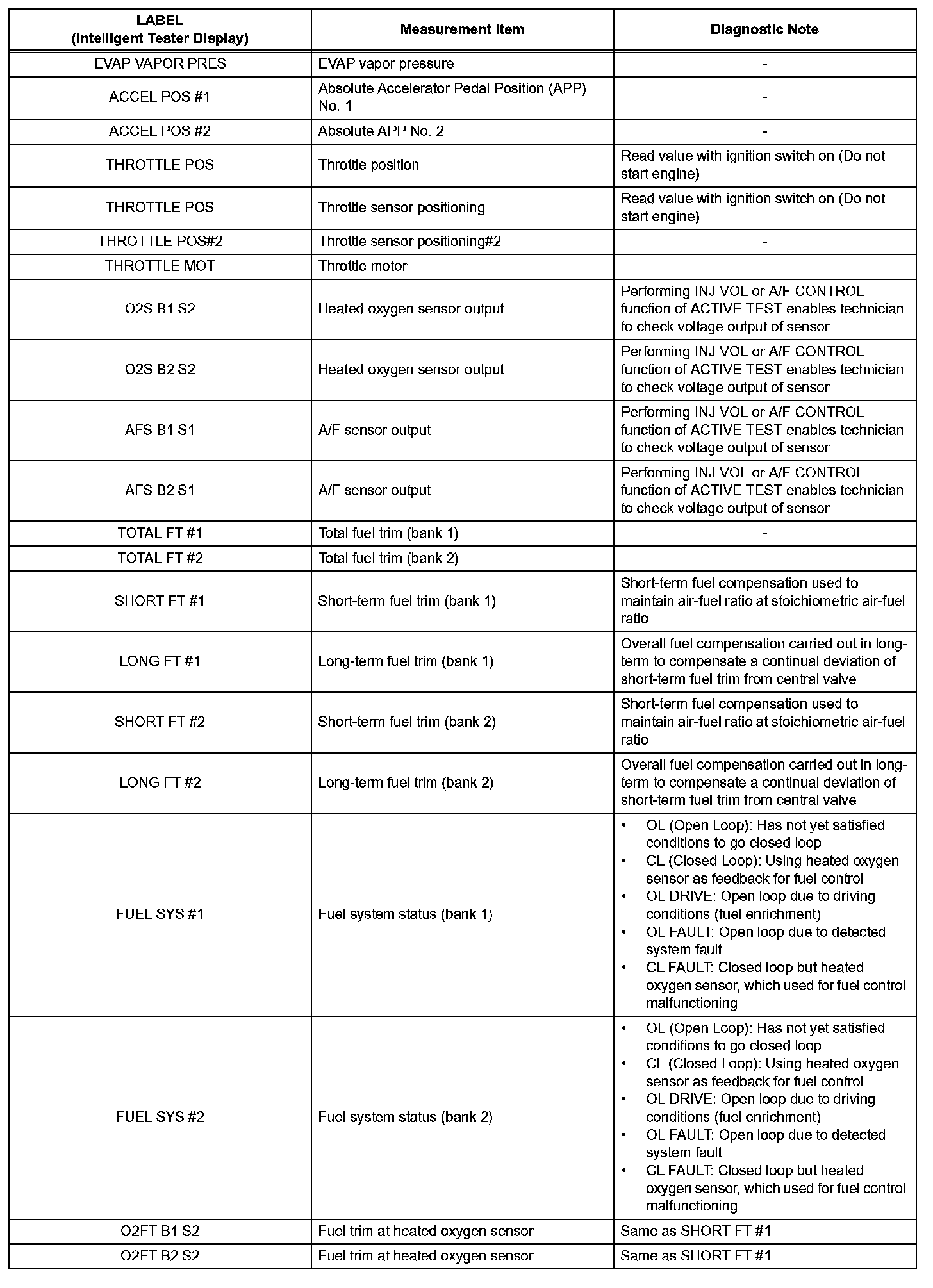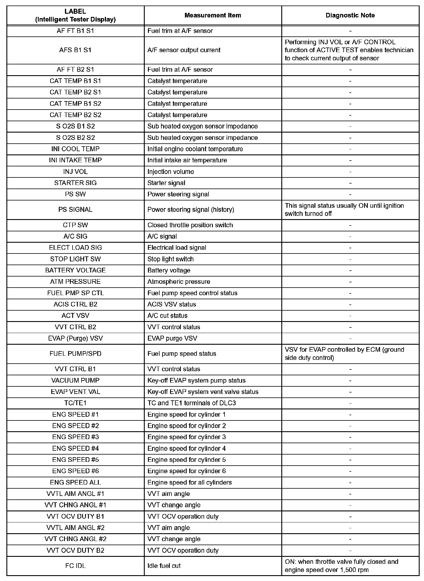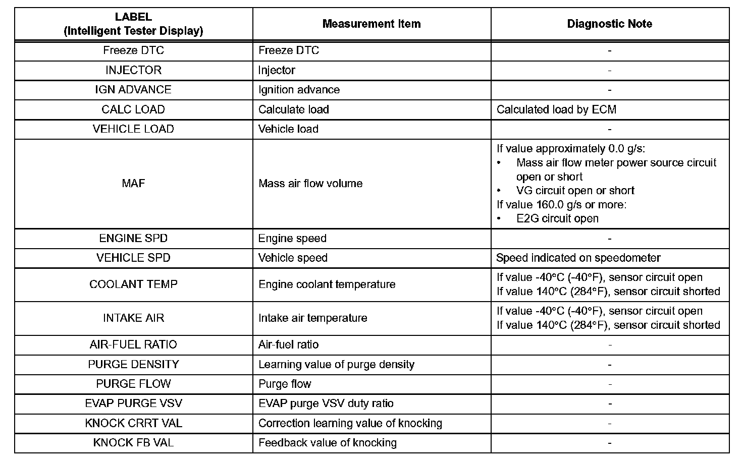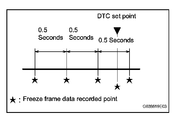 b. The ECM records engine conditions in the form of freeze frame data every 0.5 seconds. Using the intelligent tester, five separate sets of freeze frame data, including the data values at the time when the DTC was set, can be checked.