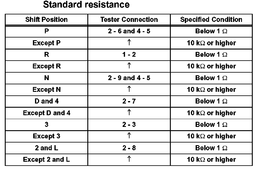 (c) Measure resistance according to the value(s) in the table when the shift lever is moved to each position.