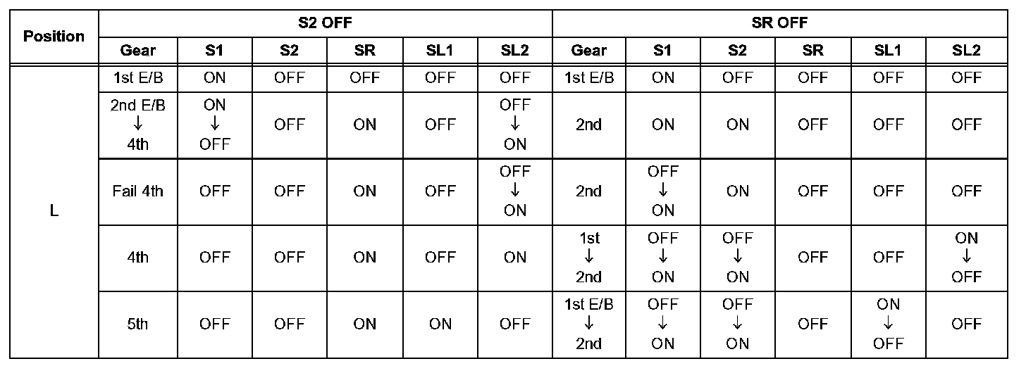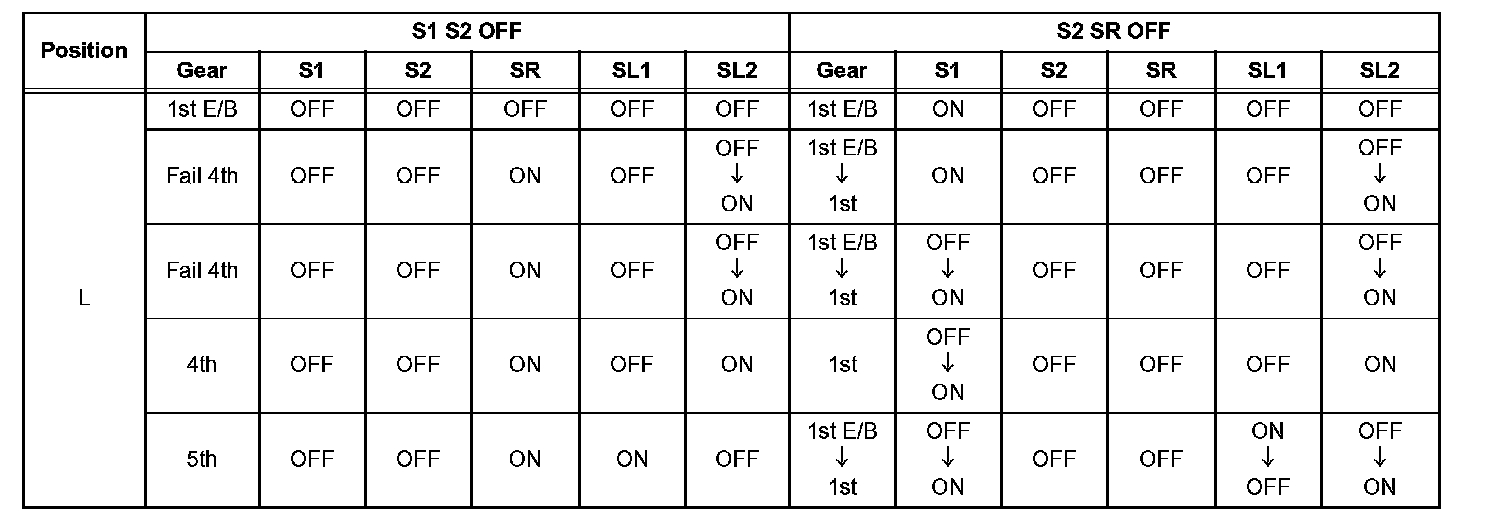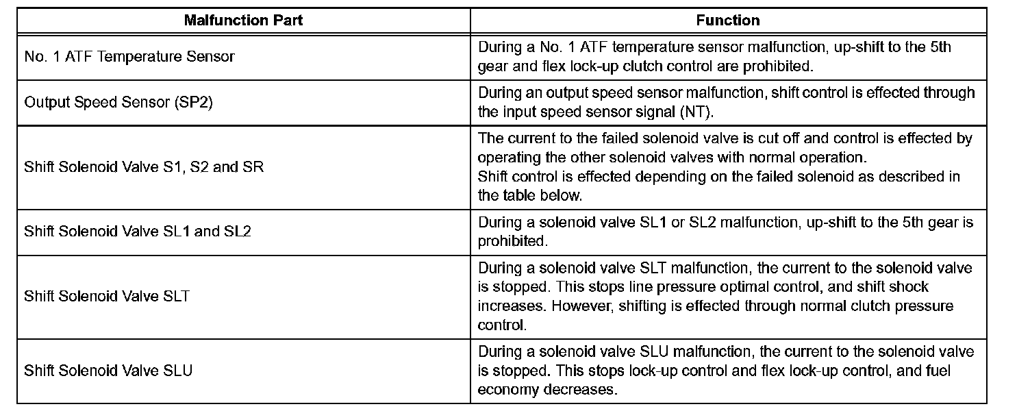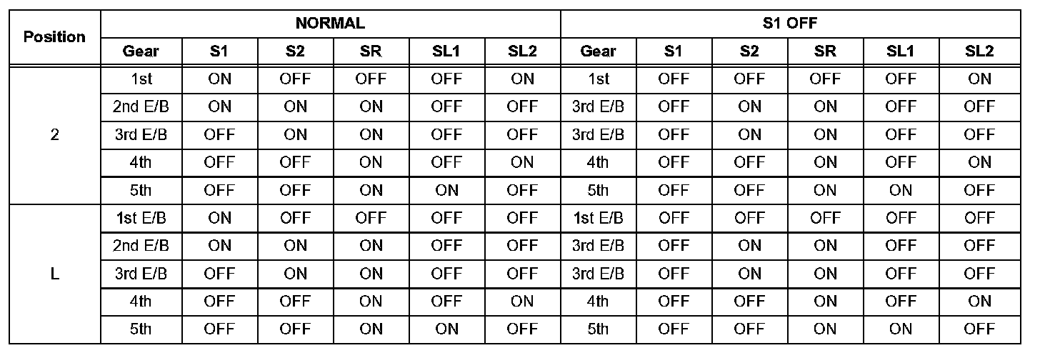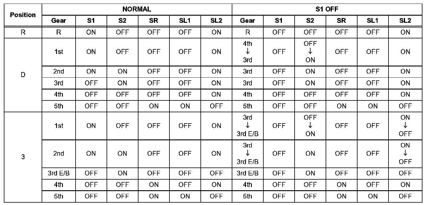 If either of the shift solenoid valve circuits has an open or short failure, the ECM turns the other shift solenoid ON and OFF in order to shift into the gear positions shown in the table,.