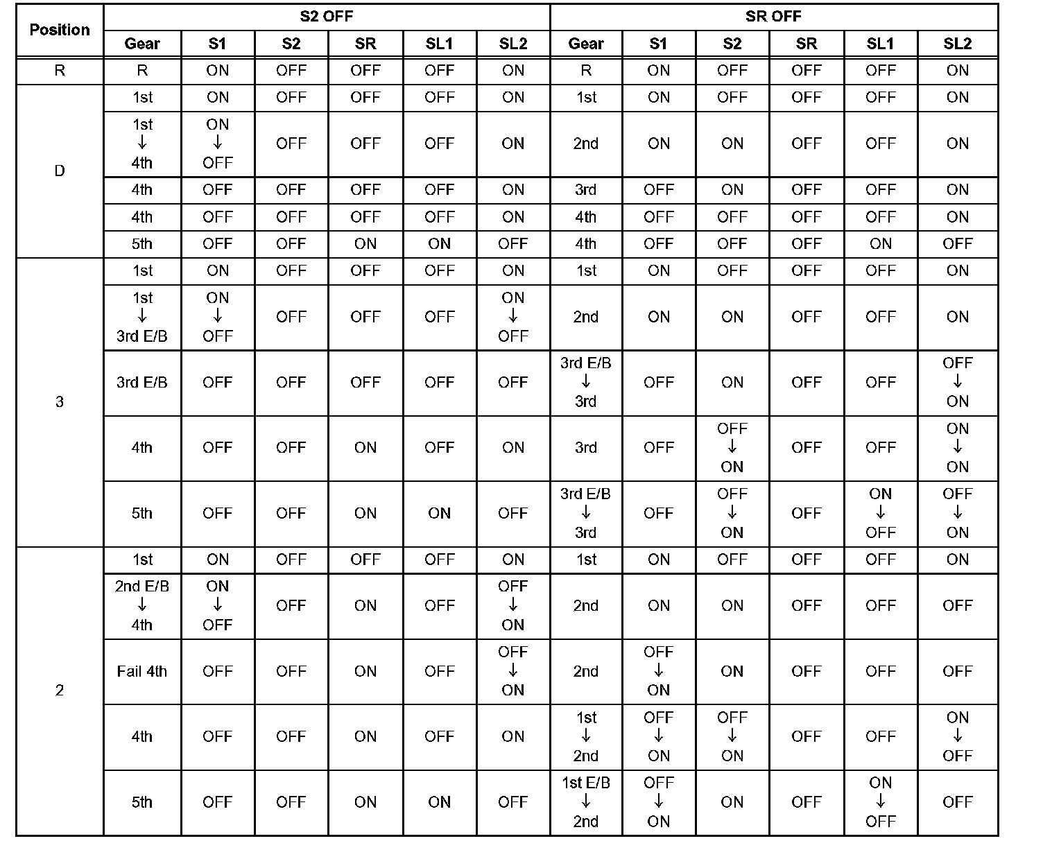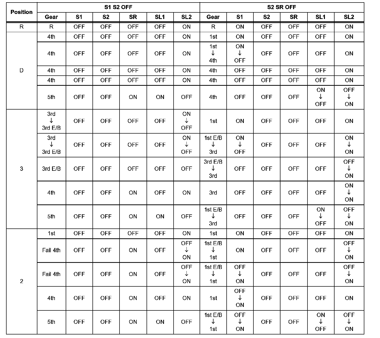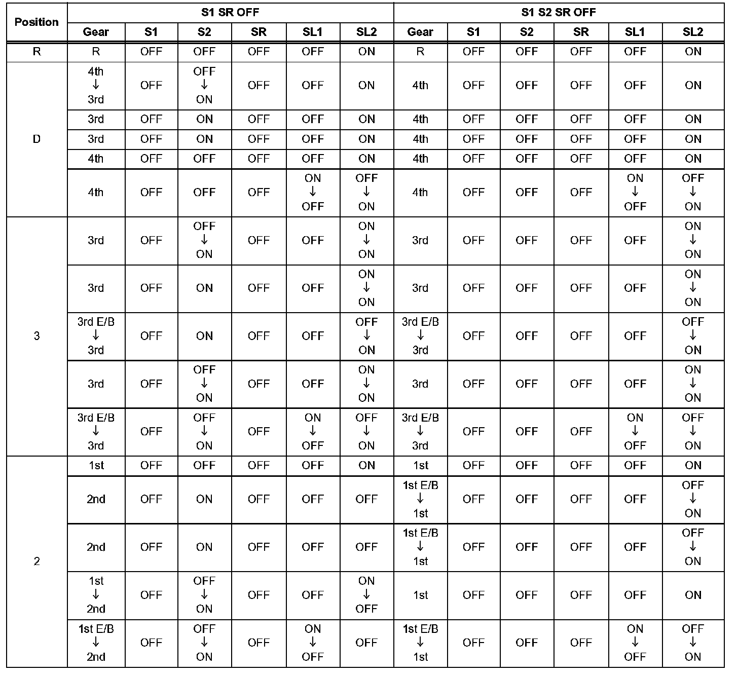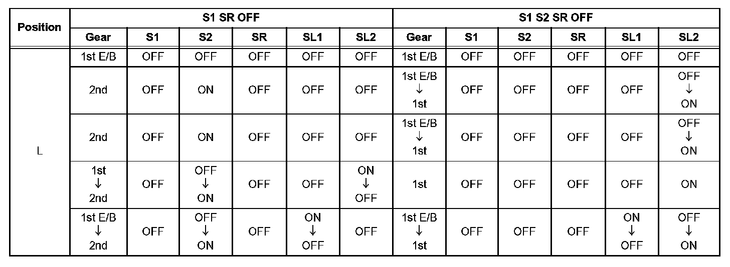 If either of the shift solenoid valve circuits has an open or short failure, the ECM turns the other shift solenoid ON and OFF in order to shift into the gear positions shown in the table,.
