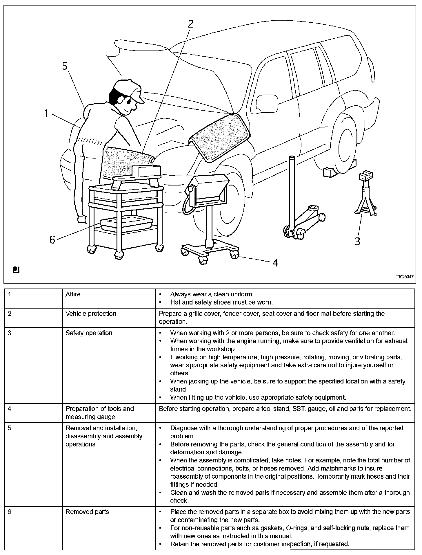 1. Care must be taken when jacking up and supporting the vehicle. Be sure to lift and support the vehicle at the proper locations.