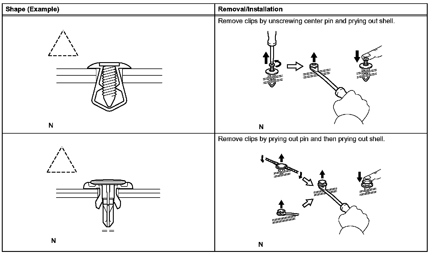1. The removal and installation methods of typical clips used for vehicle body parts are shown in the table.