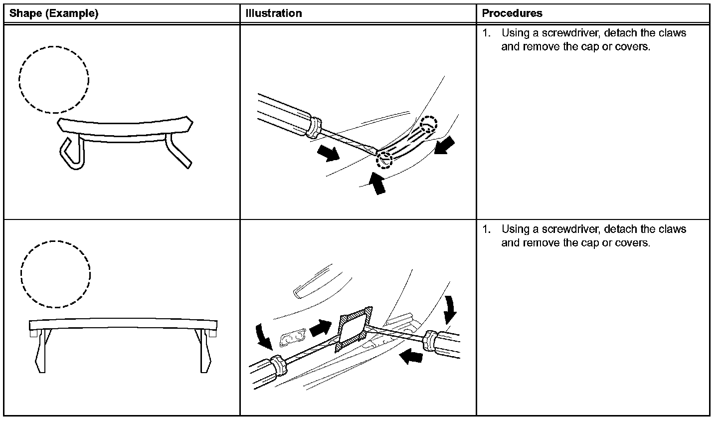 1. The removal and installation methods of typical claws used for vehicle body parts are shown in the table.