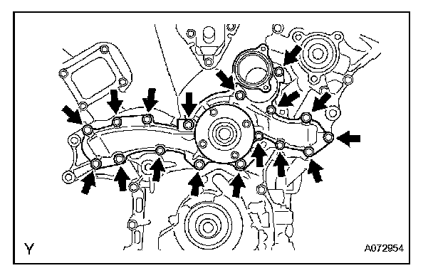 Install a new gasket and the water pump with the 17 bolts.