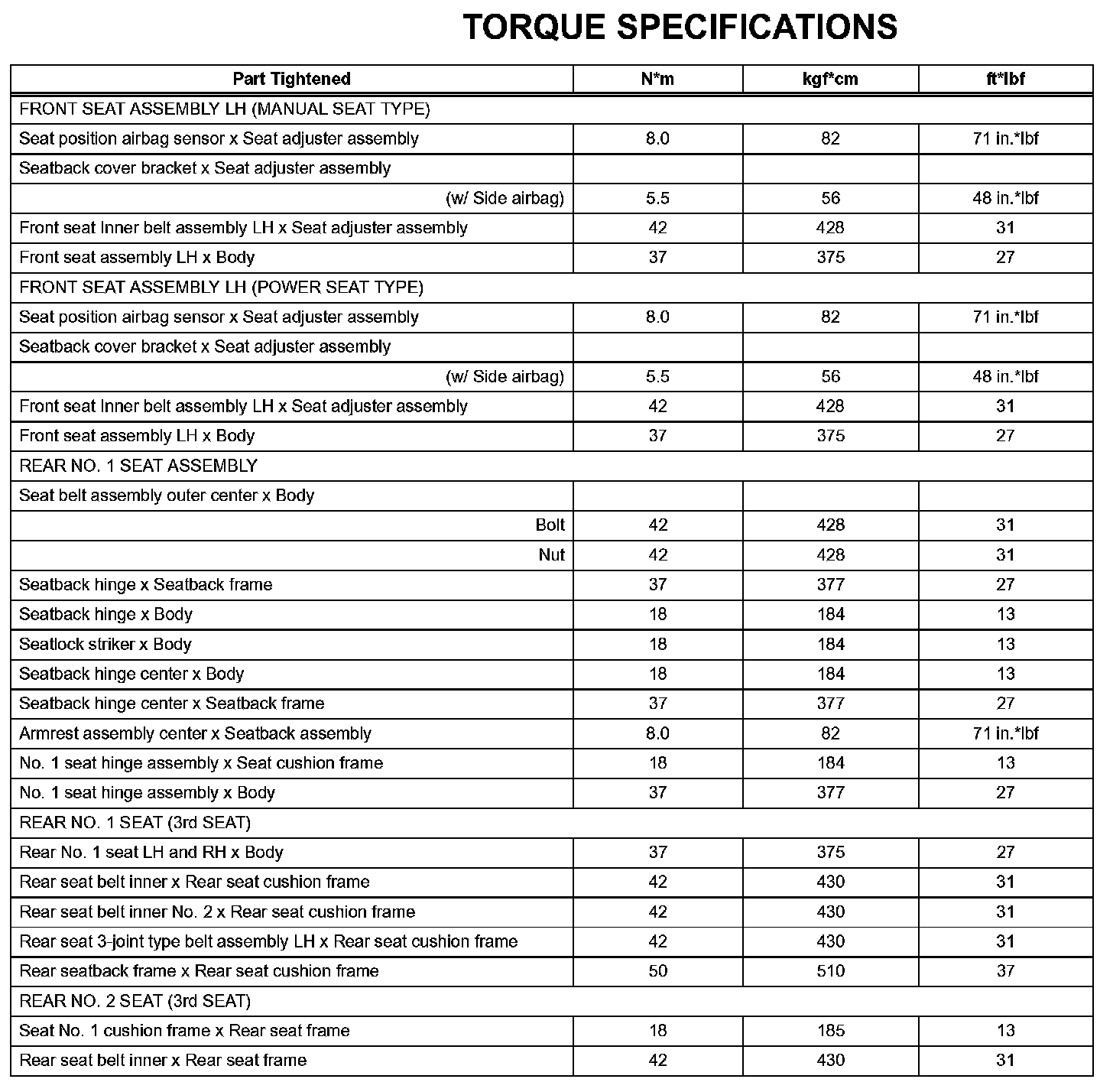 Seat - Torque Specifications: