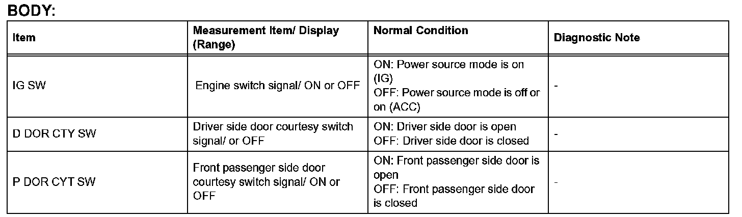 HINT: Using the DATA LIST displayed on the intelligent tester, the value of the switch, sensor, actuator, etc.can be read without part removal. Reading the DATA LIST as the first step of troubleshooting is one way to shorten the labor time.