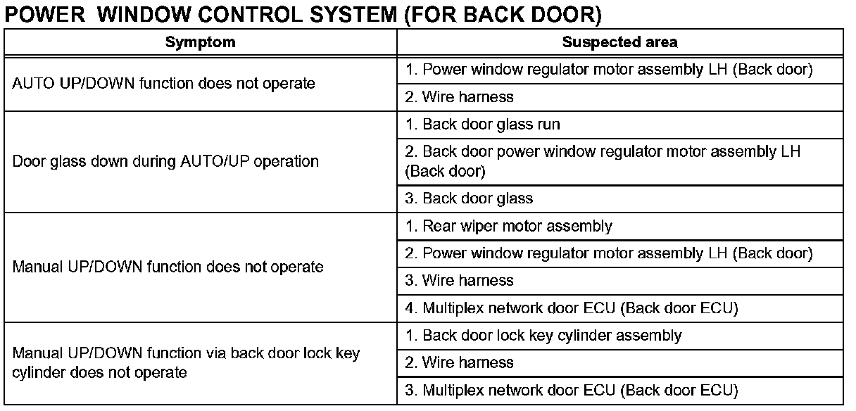 Problem Symptoms Table - Power Window Control System(For Back Door):