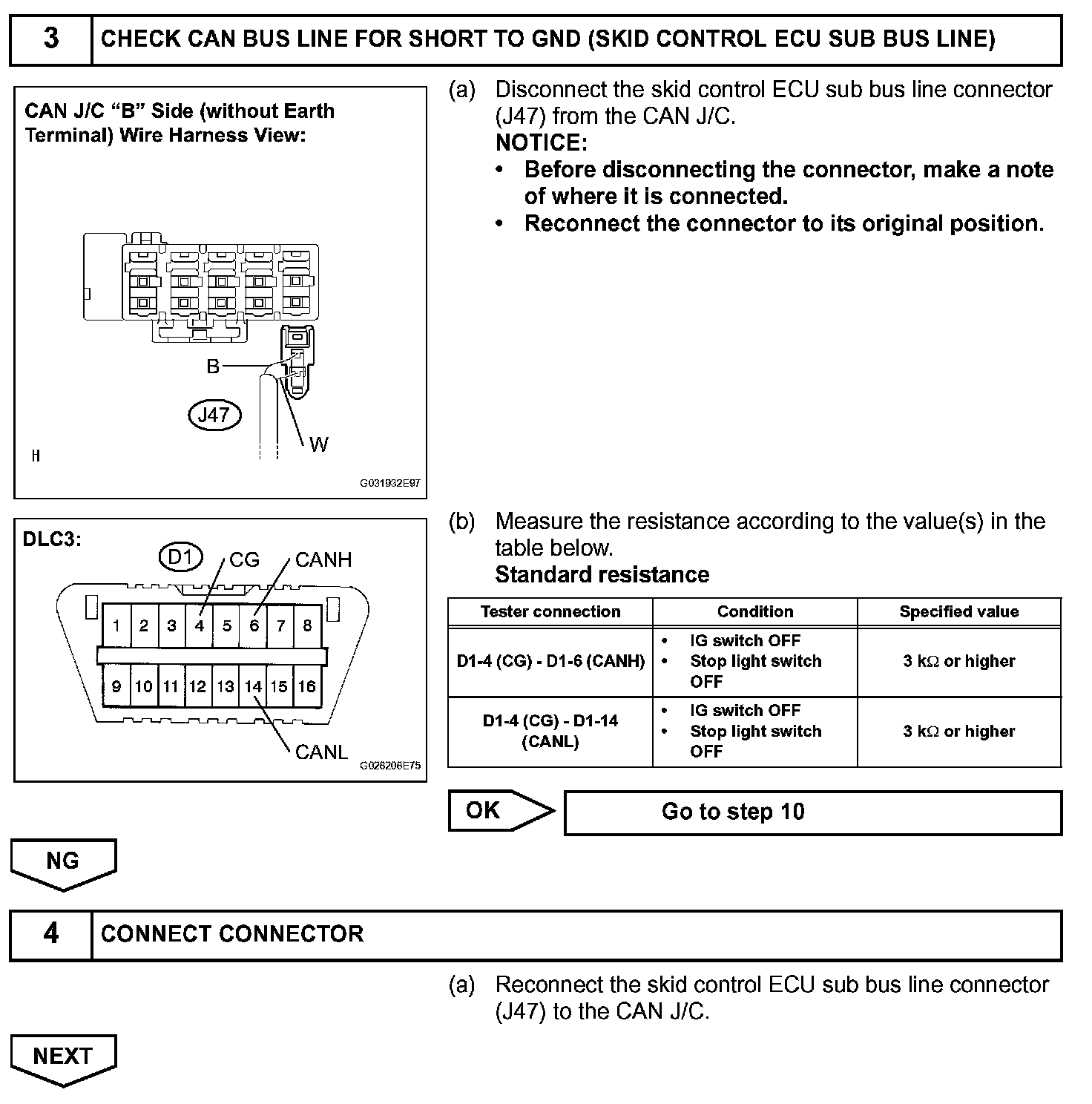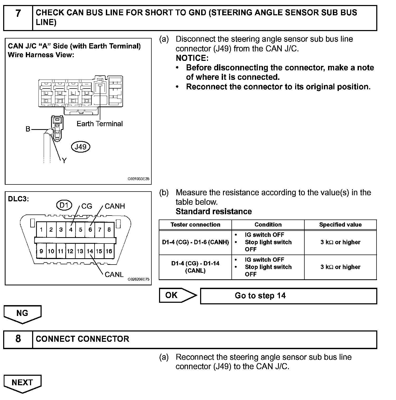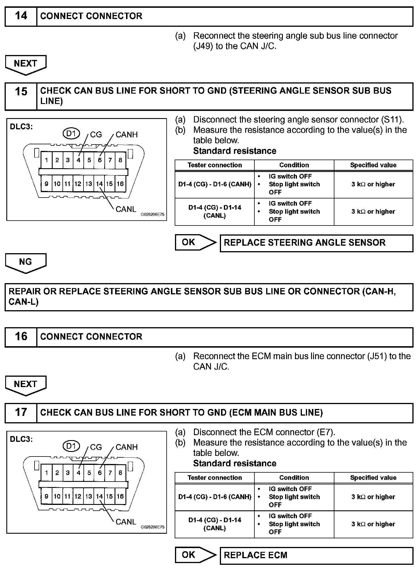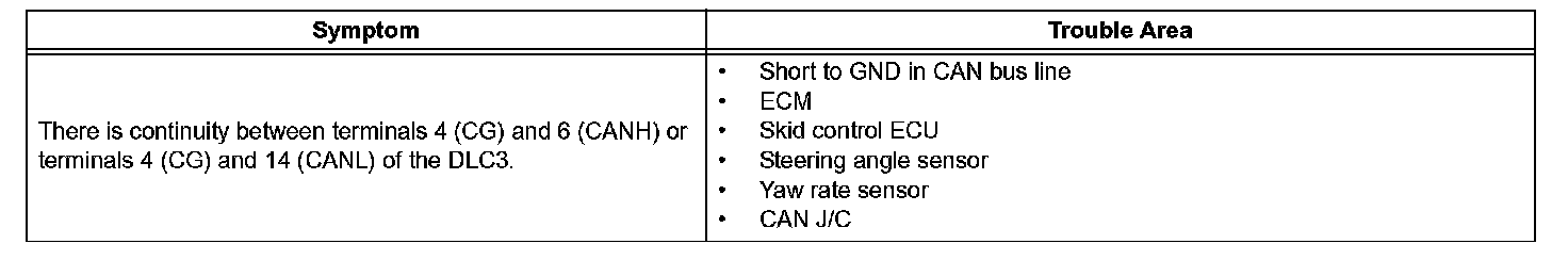 Check CAN Bus Line for Short to GNDDESCRIPTIONA short to GND is suspected in the CAN bus line when there is continuity between terminals 4 (CG) and 6 (CANH) or terminals 4 (CG) and 14 (CANL) of the