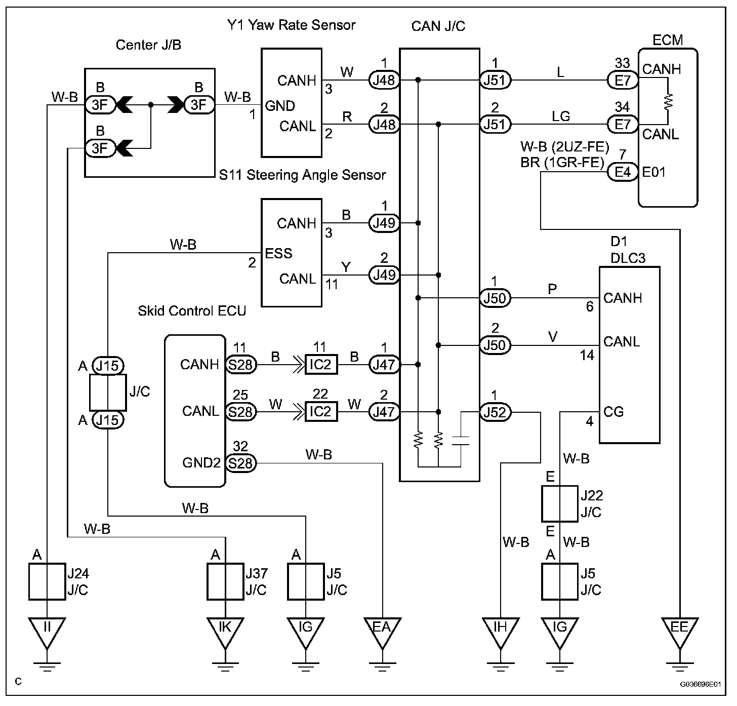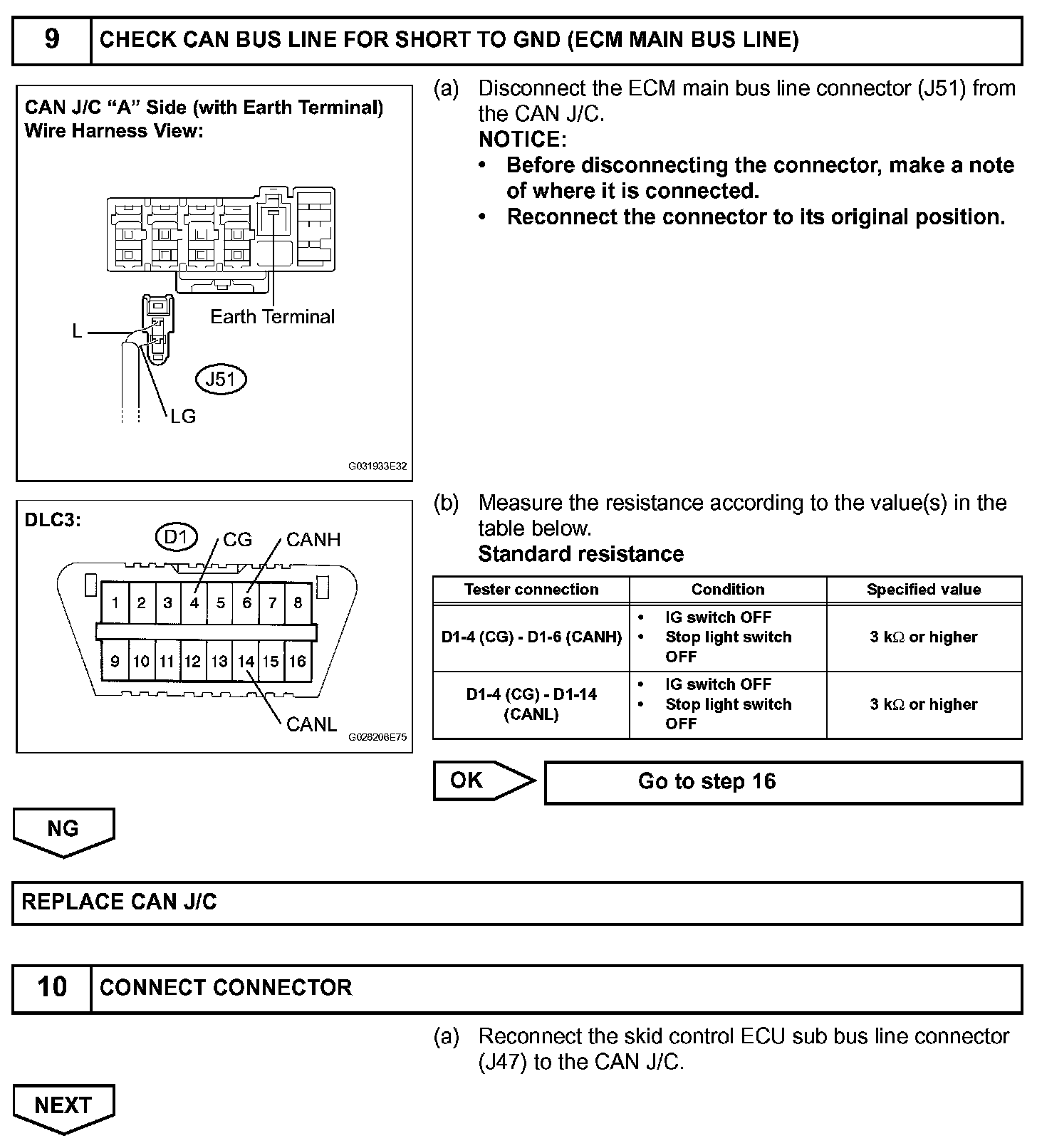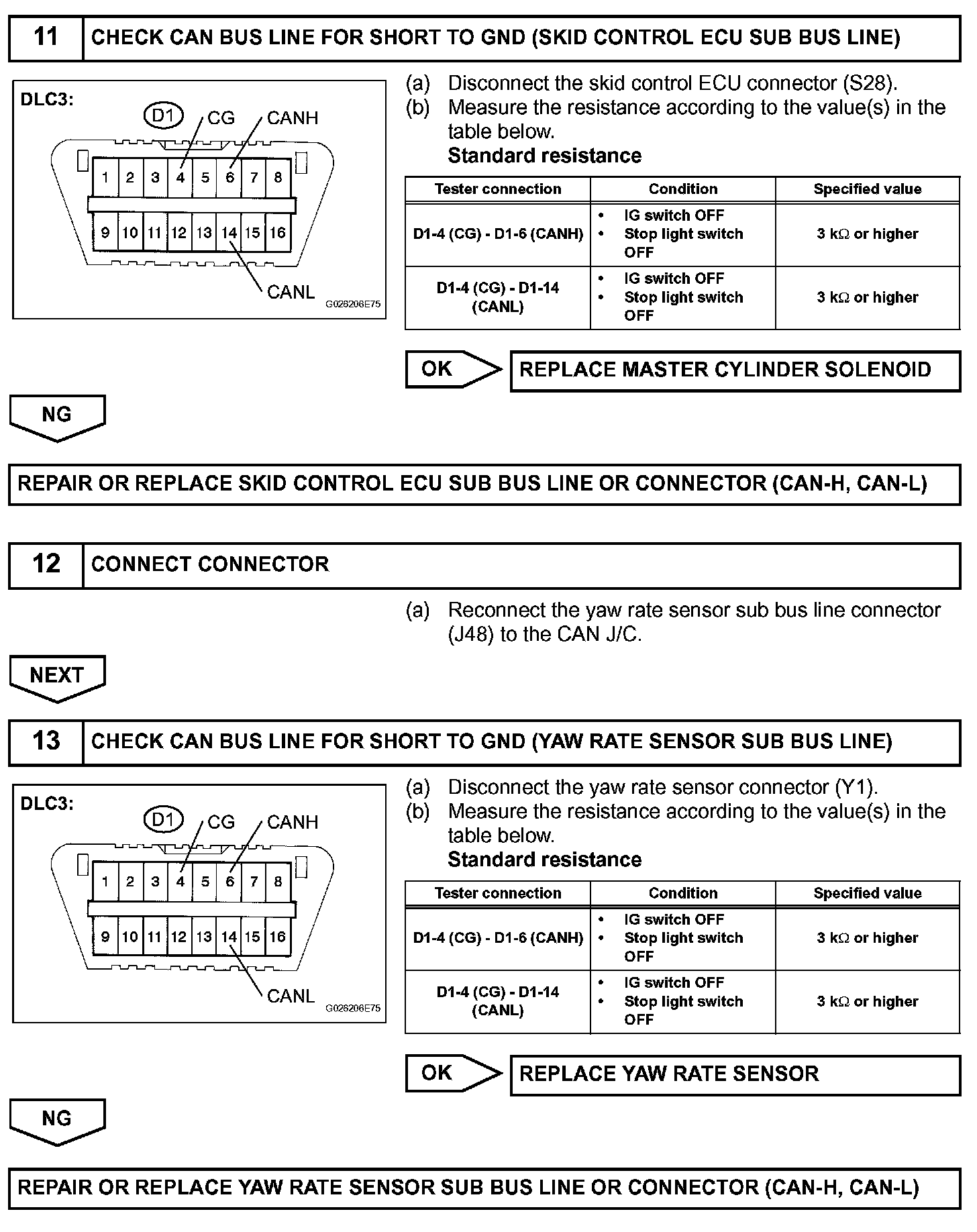 Check CAN Bus Line for Short to GNDDESCRIPTIONA short to GND is suspected in the CAN bus line when there is continuity between terminals 4 (CG) and 6 (CANH) or terminals 4 (CG) and 14 (CANL) of the