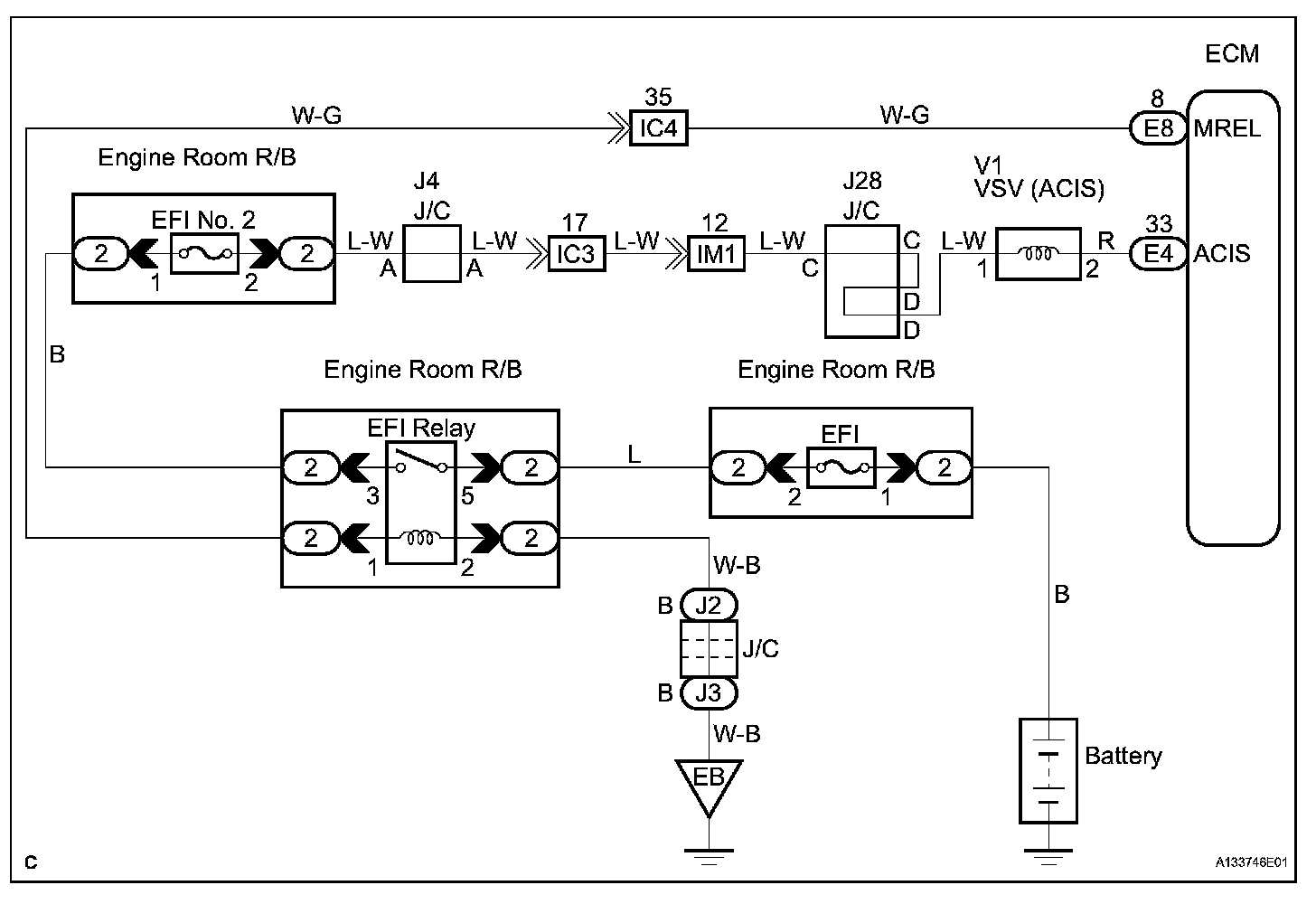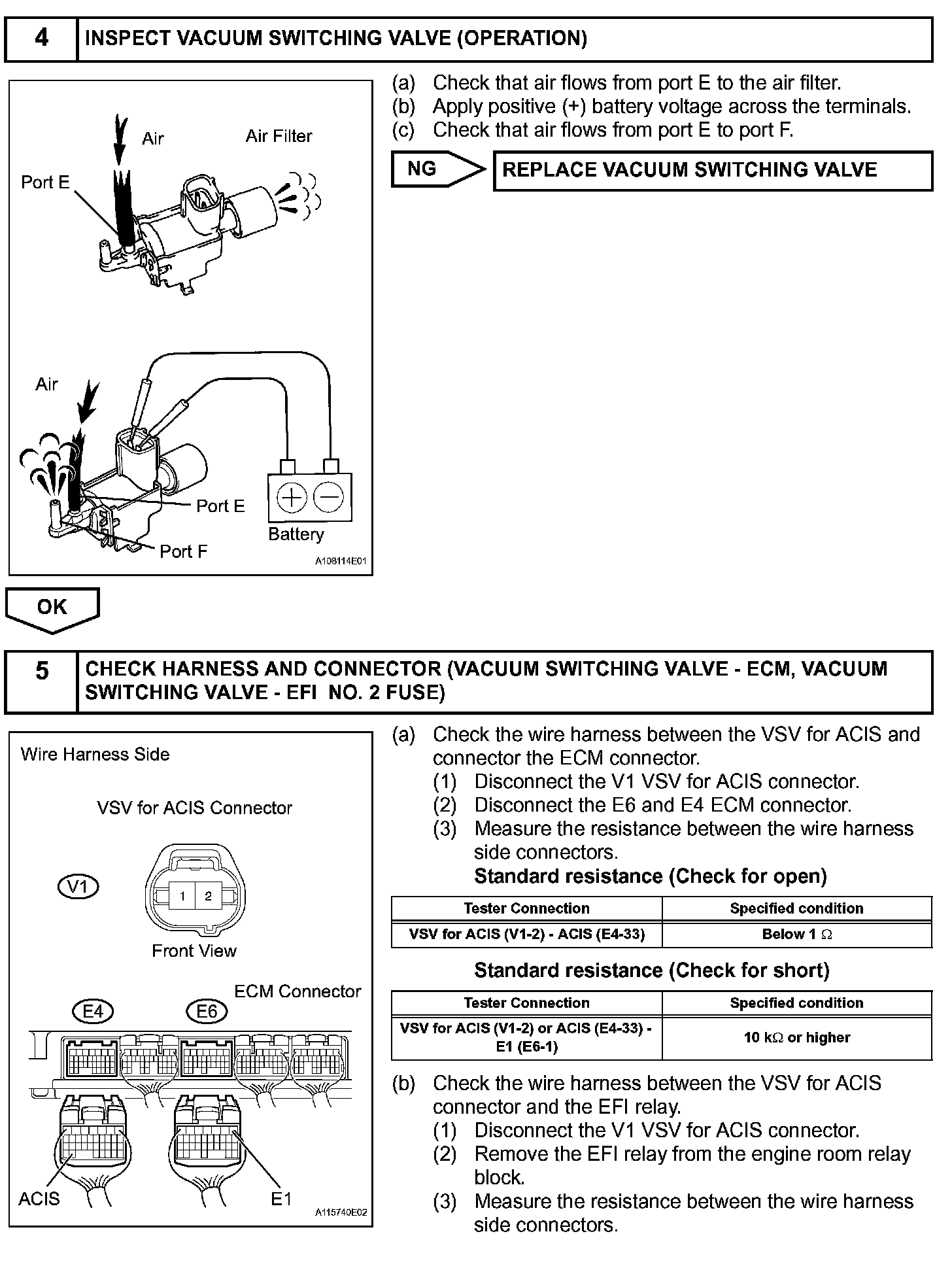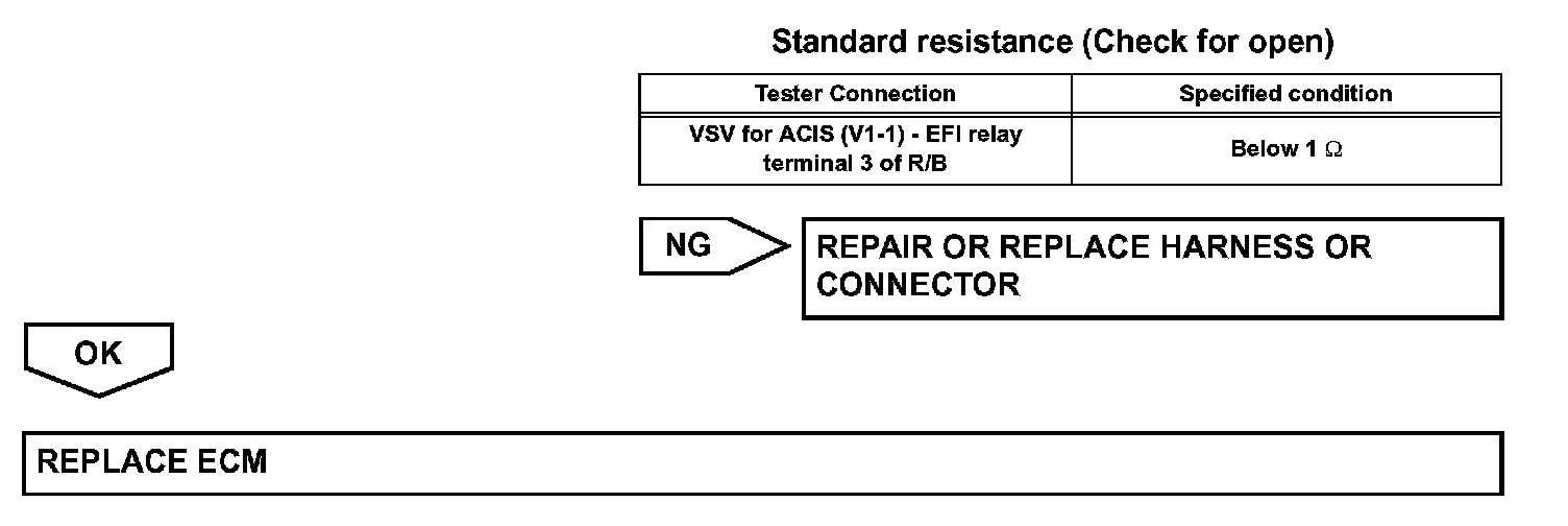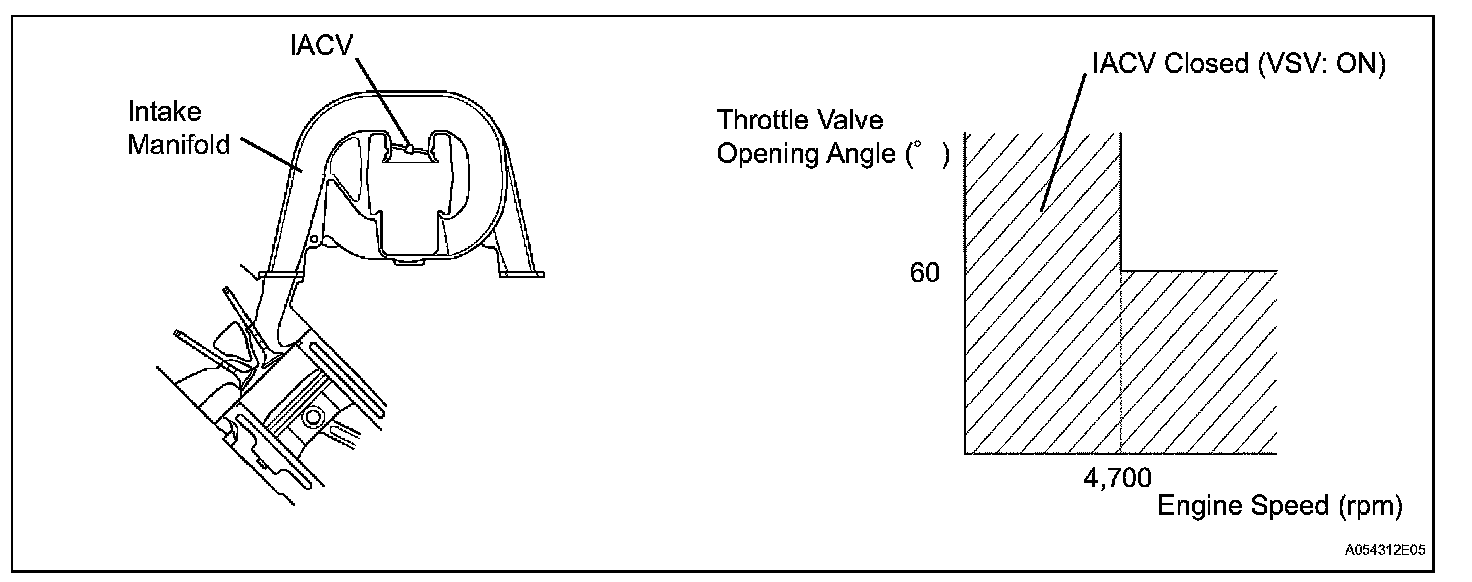 This circuit opens and closes the Intake Air Control Valve (IACV) in response to the engine load in order to increase the intake efficiency (ACIS: Acoustic Control Induction System). When the engine speed is 4,700 rpm or more and the throttle valve opening angle is 60° or more, the IACV is open (VSV: OFF). At all other times, the IACV is closed (VSV: ON).