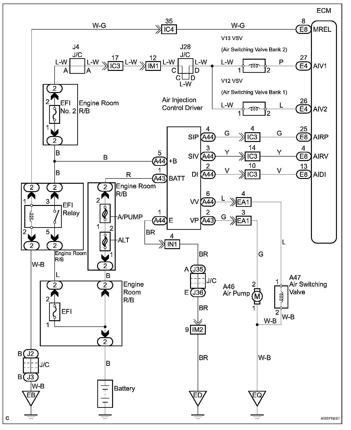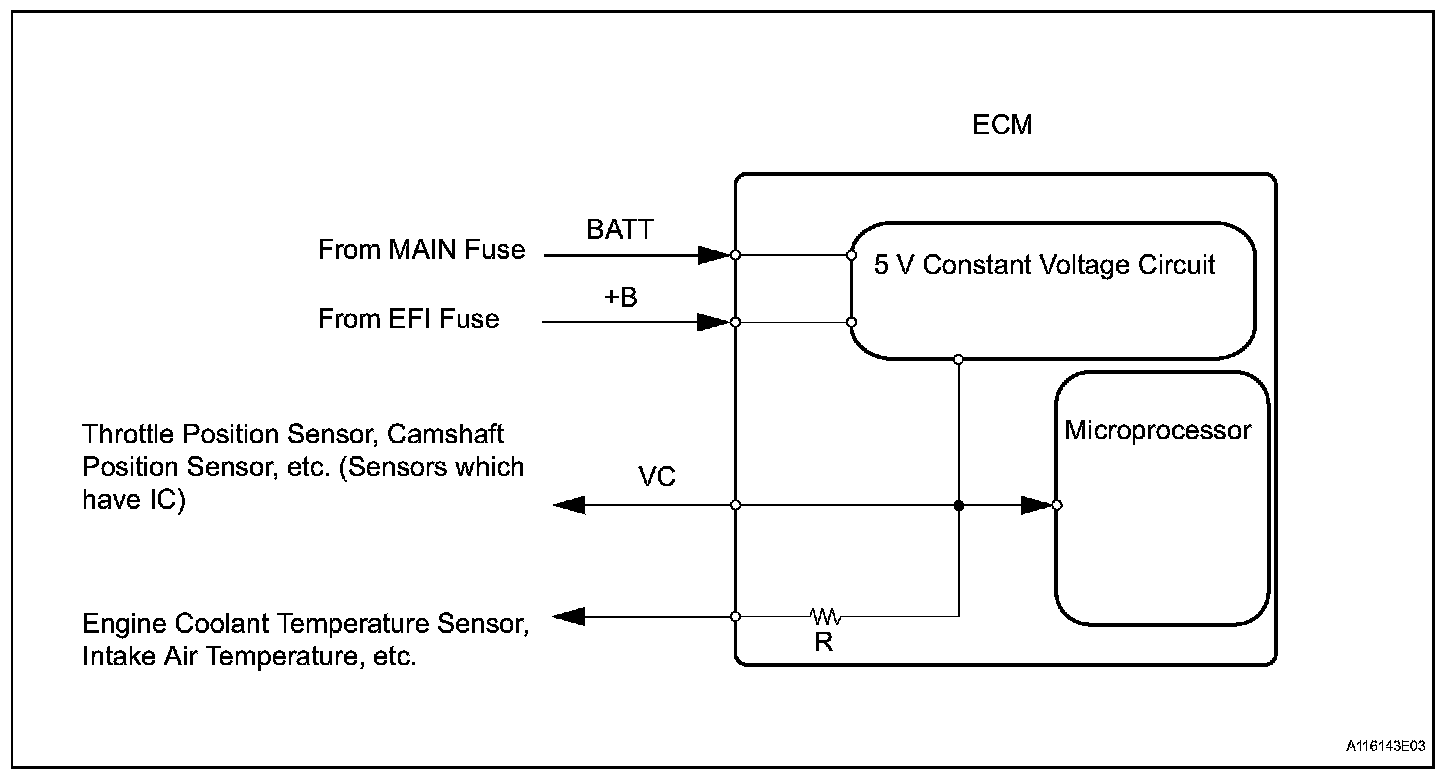 The ECM constantly generates 5 V power from the battery voltage supplied to the +B (BATT) terminal to operate the microprocessor. The ECM also provides this power to the sensors through the VC output circuit.