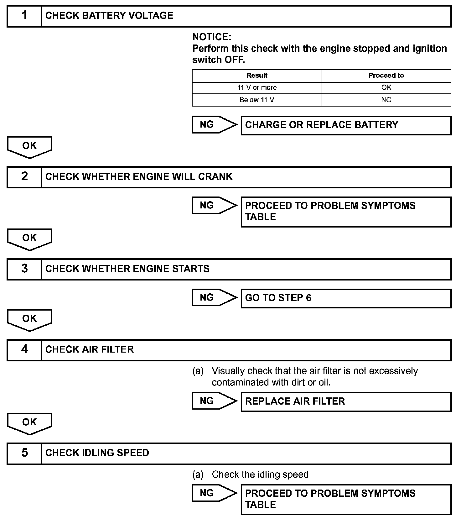 When the malfunction is not confirmed by the DTC check, troubleshooting should be carried out in all circuits considered to be possible causes of the problem. In many cases, by carrying out the basic engine check shown in the flowchart, the location of the problem can be found quickly and efficiently. Therefore, using this check is essential when engine troubleshooting.