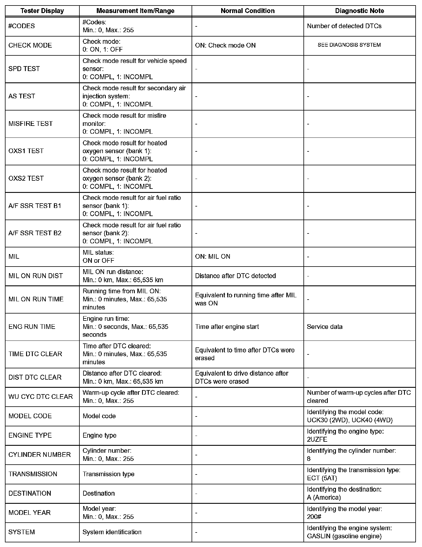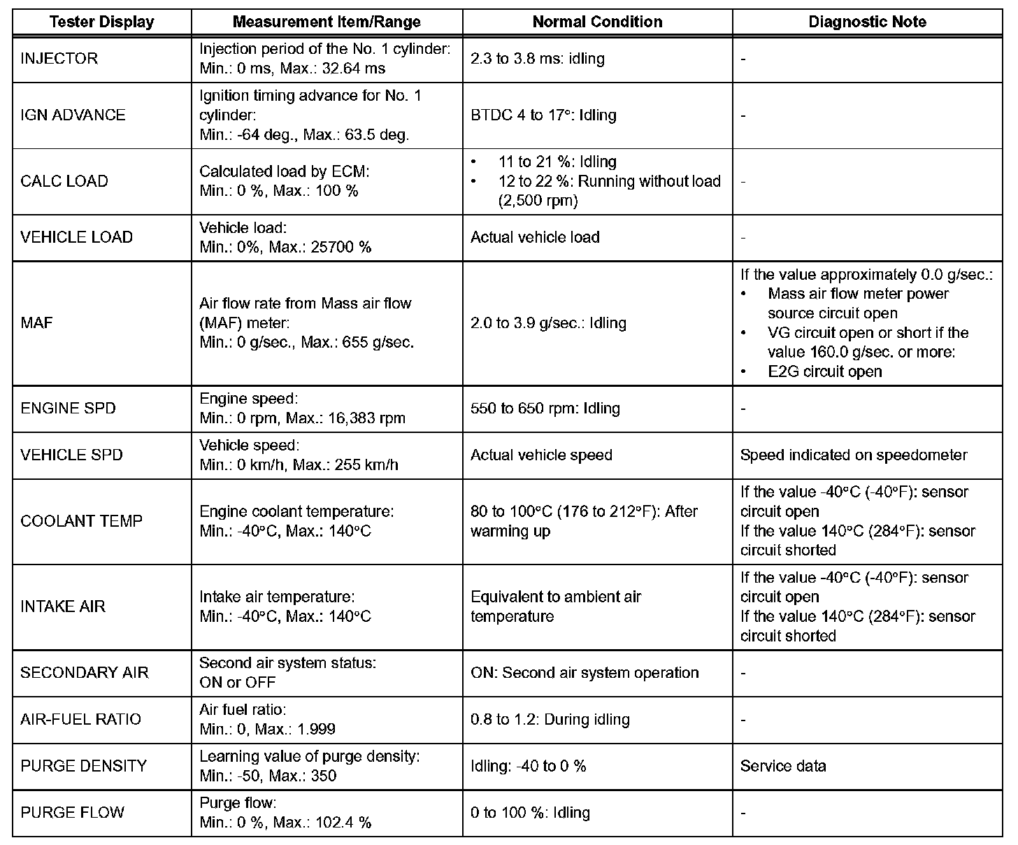 DATA LISTHINT: Using the hand-held tester, DATA LIST allows switch, sensor, actuator and other item values to be read without removing any parts. Reading DATA LIST early in troubleshooting is one way to shorten labor time.
