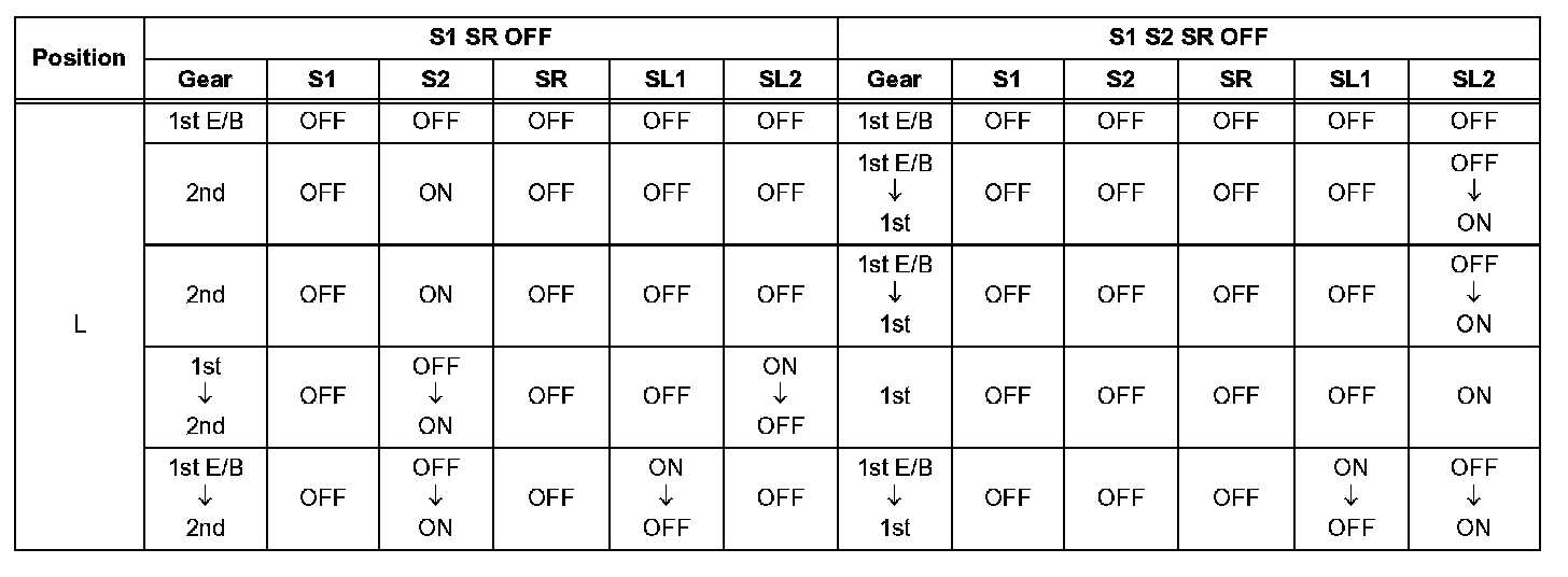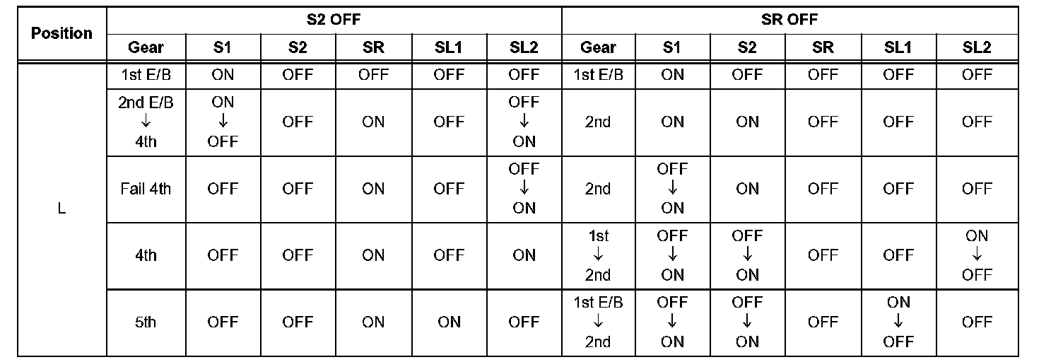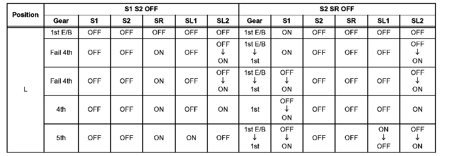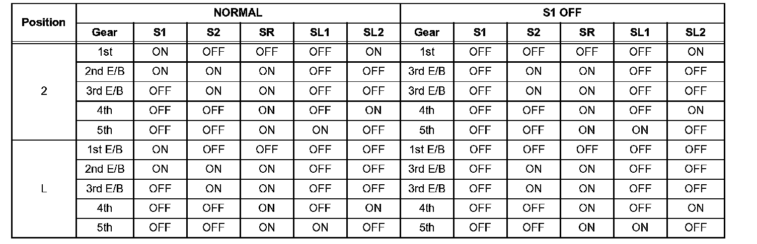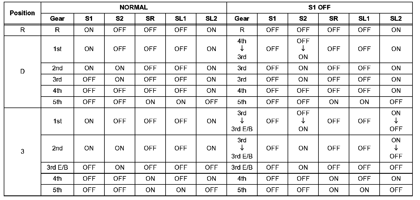 If either of the shift solenoid valve circuits has an open or short failure, the ECM turns the other shift solenoid ON and OFF in order to shift into the gear positions shown in the table.